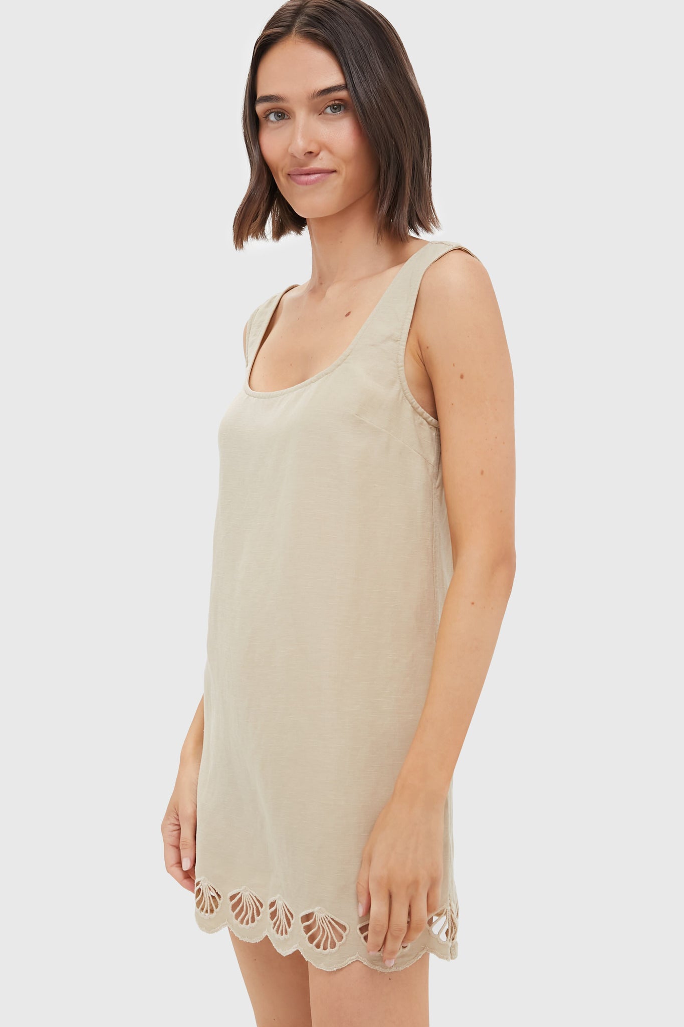 This chic pullover minidress has a relaxed. boxy fit. with a scoop neck and a slight A-line hem. finished with embroidery along the scalloped edge. TIt's tailored in a breezy linen blend fabric. it's perfect for days spent by the water or around town. We are styling it with sandals and a tote. and switching to platform espadrilles for dinner!