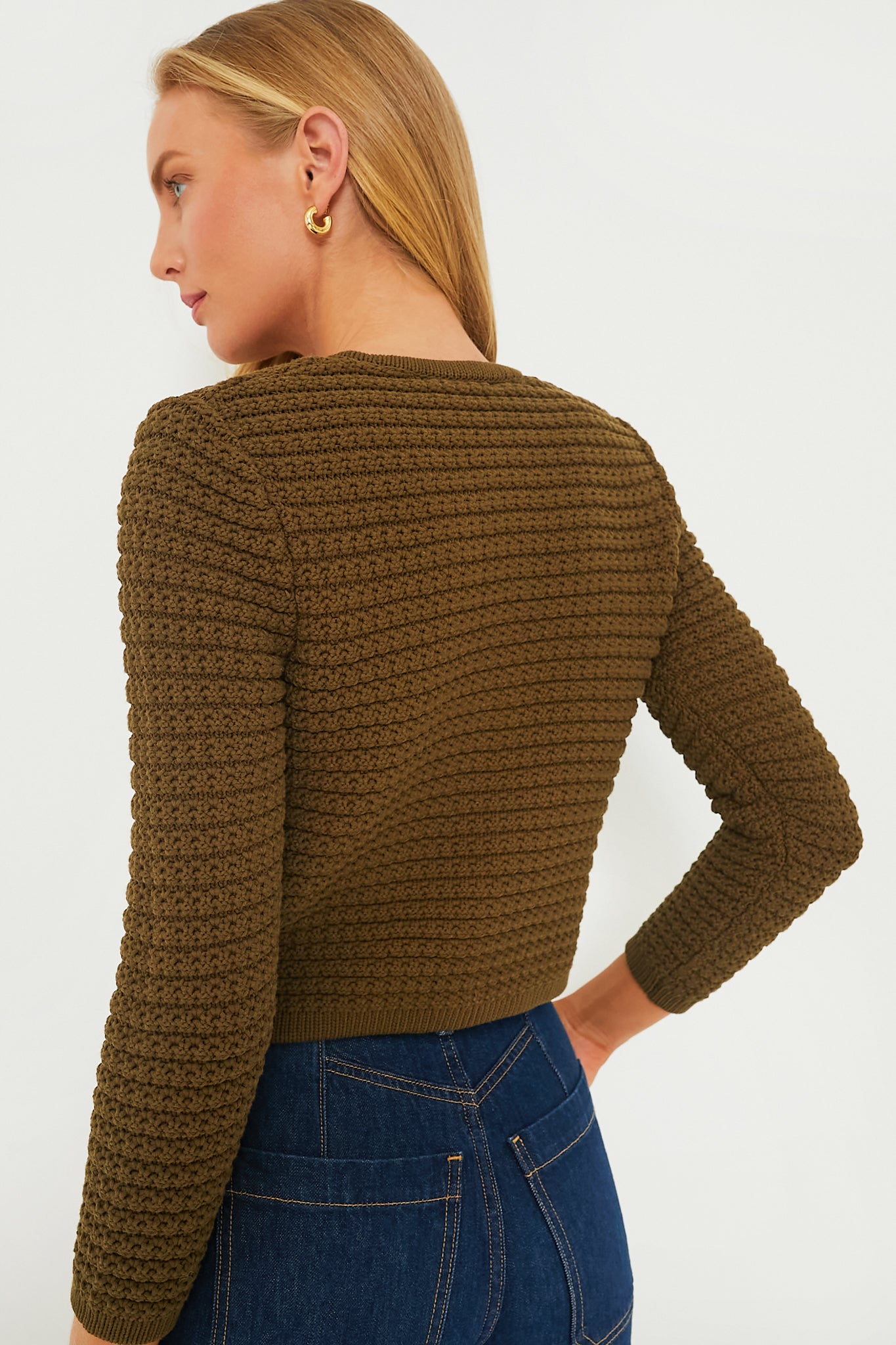 The Kaki Gaspard Cardigan is designed like a little couture jacket that's revisited in a knit. This cropped silhouette has a round neckline. long bracelet length sleeves to show off your arm candy. and glamorous round buttons along the front. Stylish and warm. it will quickly become your go-to sweater for both work and nights out. Wear this cardigan open over a dress. or layered over a blouse. Elegance. guaranteed!