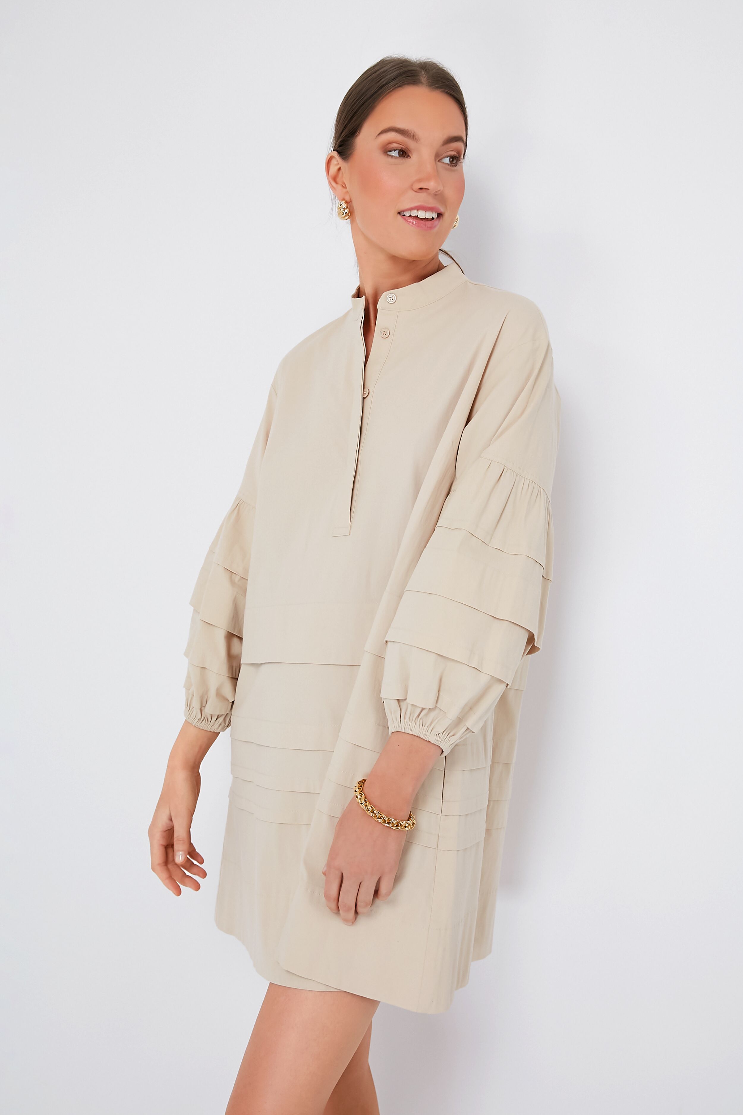 The Chelsea Dress is not to be overlooked. In a neutral khaki color. this mini combines darling and bold details for a chic. effortless day-to-night piece. A band collar and horizontal pleats throughout create an elevated. tailored feel that will take you from desk to drinks with ease. Dress it up with heels and gold accessories or keep is casual with sneakers and a denim jacket for running around town.