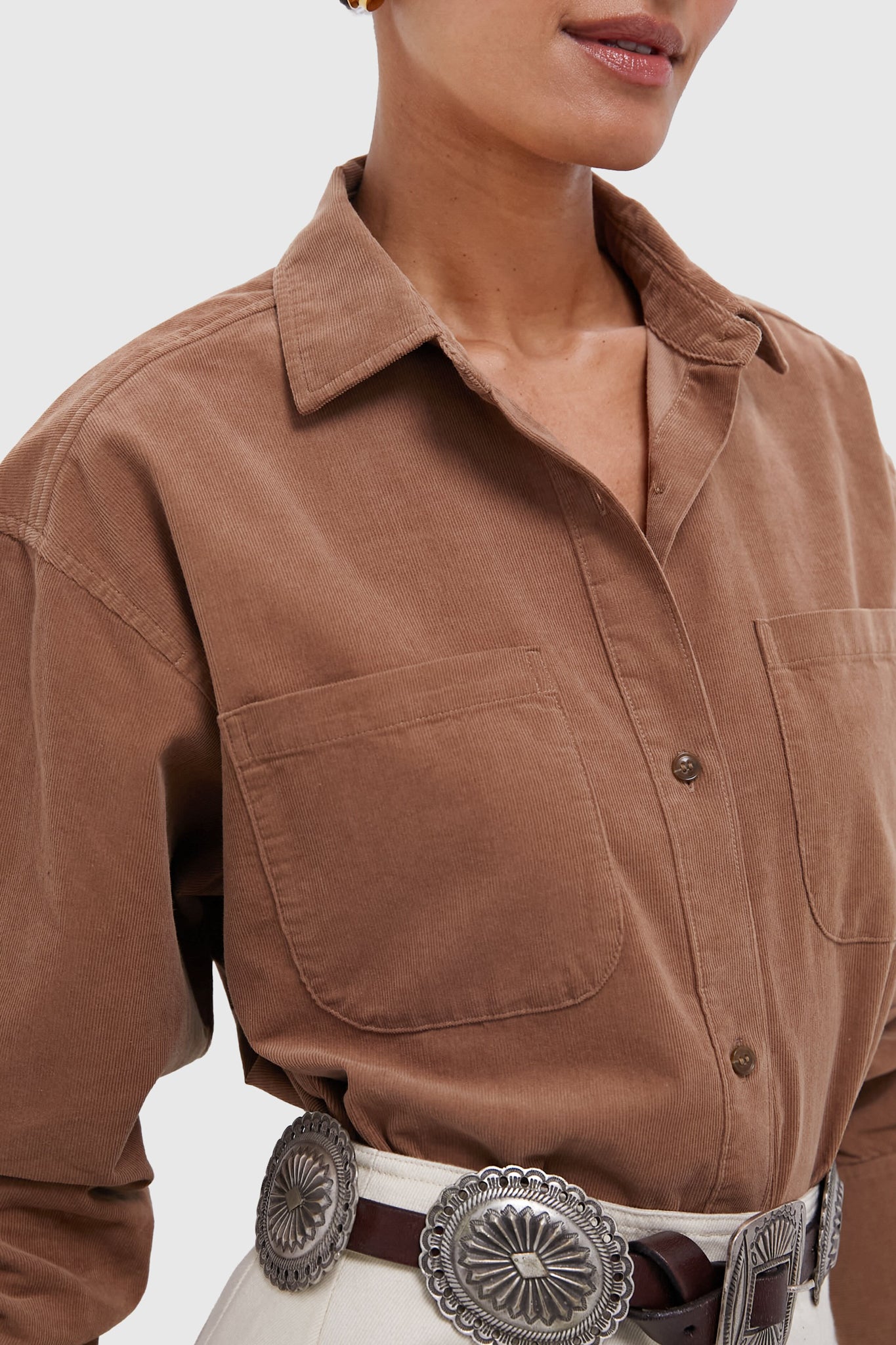 Bring your closet a much-needed staple piece with the Bryne Button Down. Made from soft corduroy. this style features contrast elbow patches and a slightly oversized silhouette that can be worn tucked or untucked. We are styling it with denim and ballet flats for a casual weekend. or styling under a blazer with boots for elevated events.