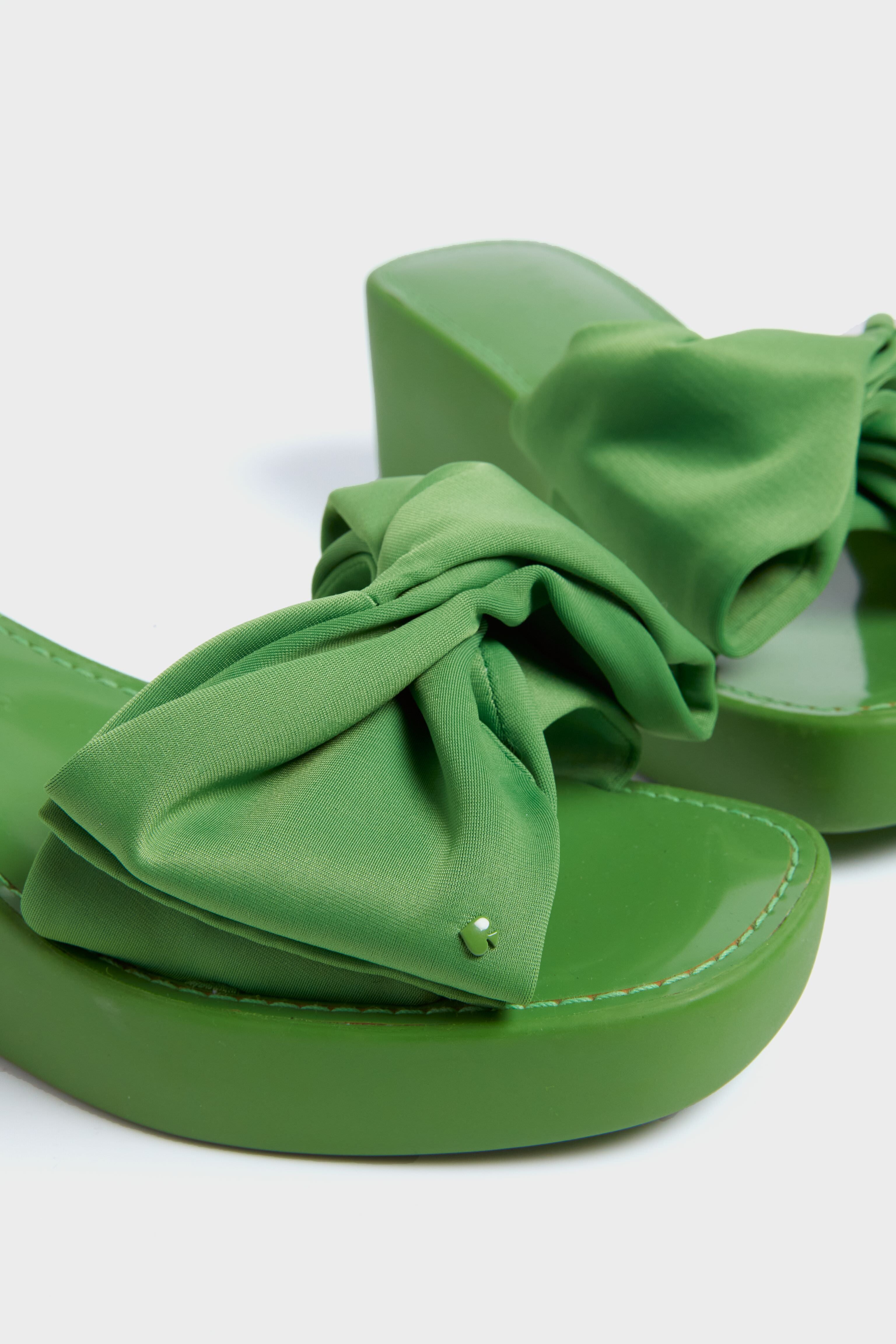 Made from cushy neoprene. these pretty bow-topped shoes are your ultimate vacation pair. The Green Bikini Wedges feature a square toe and slip-on silhouette for comfort and ease all day long. These vintage-chic stunners are sure to turn heads- simply pair with a floral maxi and sunhat or caftan and bikini!