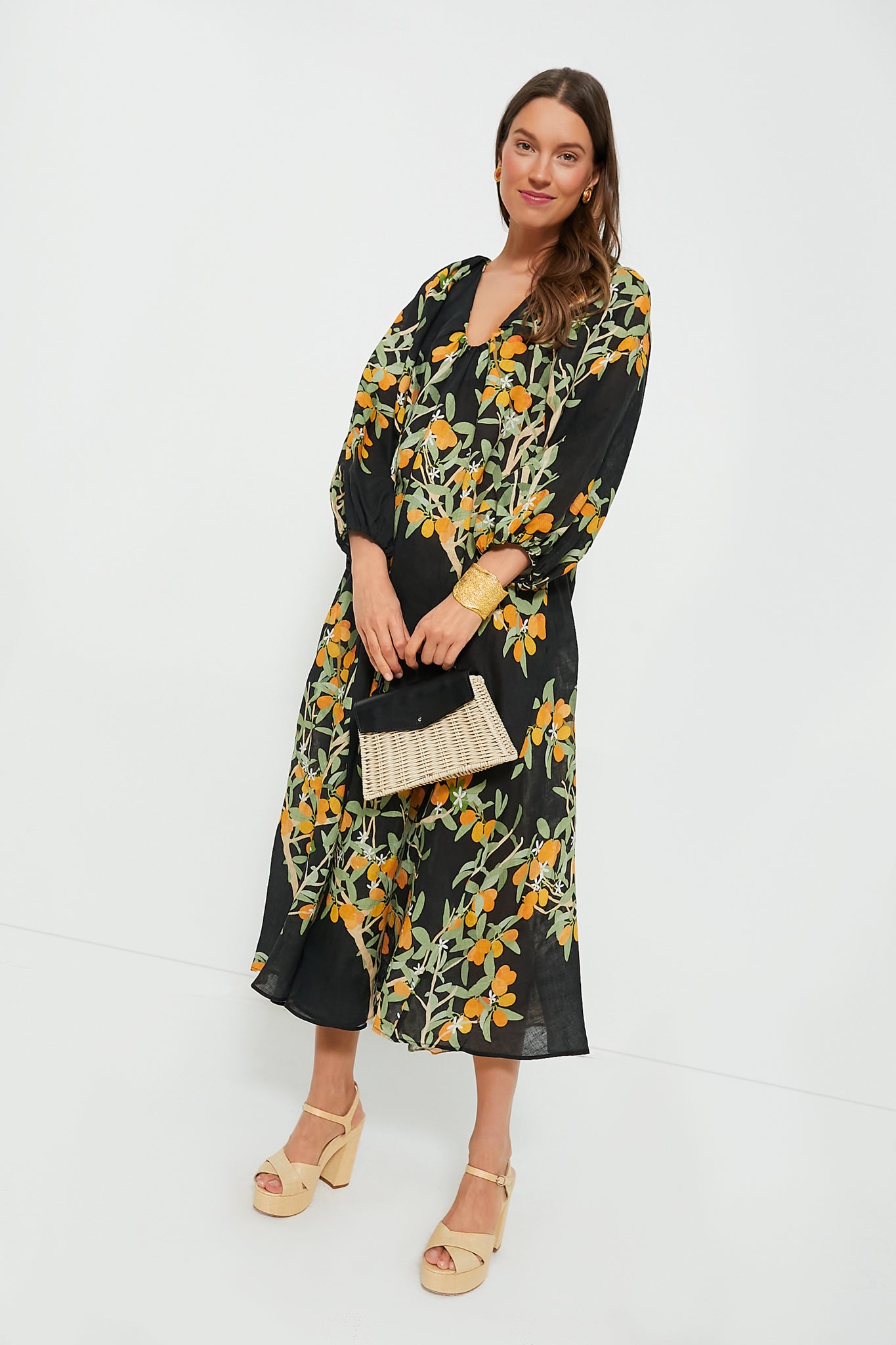 The Kumquat Georgette Dress is a chic. eye-catching number. Cut from linen and printed with a pattern depicting kumquats. this midi has an elegant v-neckline and falls in a floaty shape. longing for tropical destinations and sunny beaches. Pair with heels and clutch for added drama!