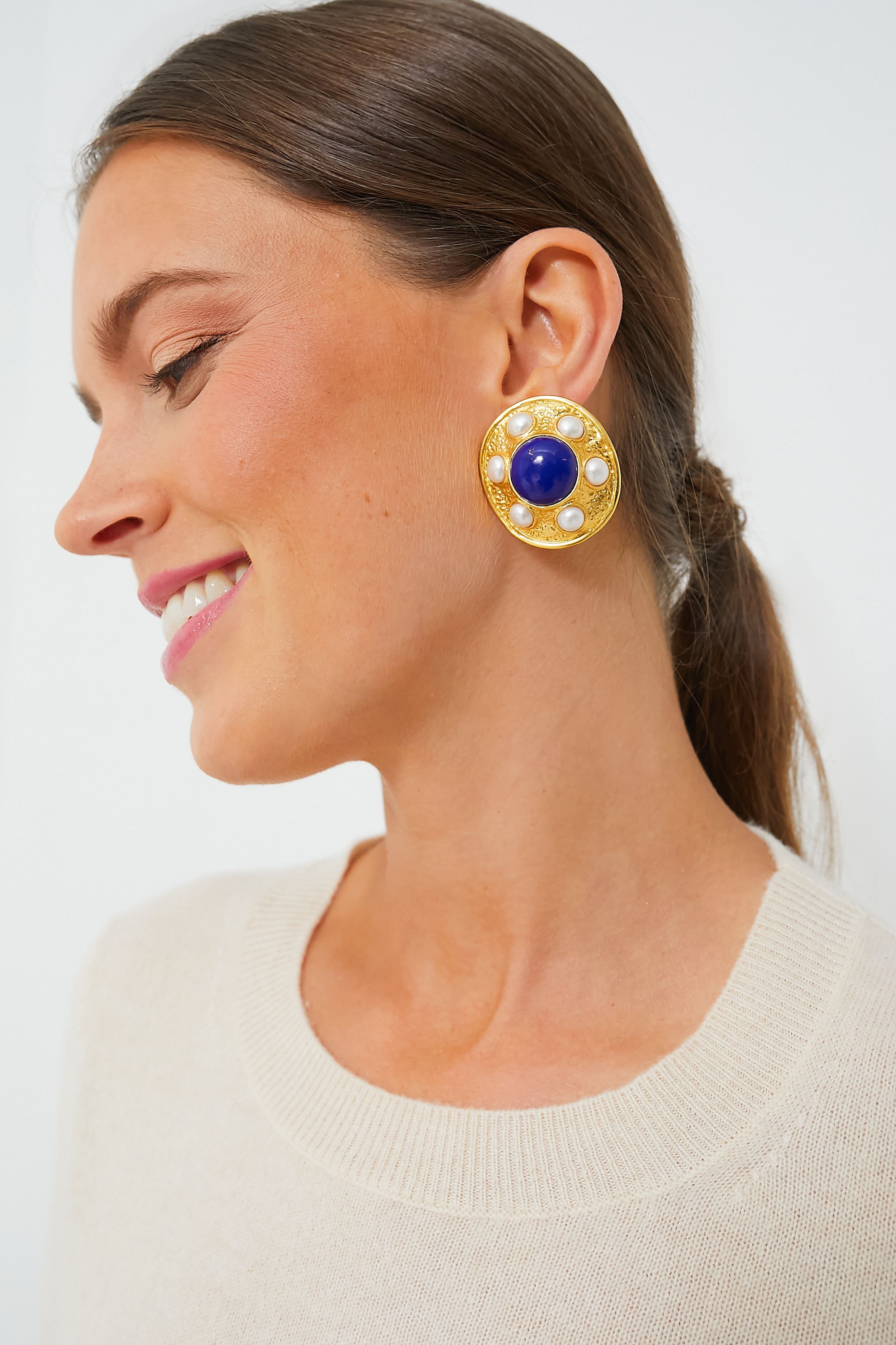 Adding a little touch of luxury to your everyday. the Vivienne Earrings make a subtle statement you're sure to love. With a slightly oversized silhouette. inlaid lapis and pearl stones. and clip-on styling so anyone can wear them. these are sure to become a go-to on the regular. Pair them with a blazer and ankle pants for an elevated office look. with a sweater and denim for weekend brunches. or with a mini dress and heels for special celebrations.