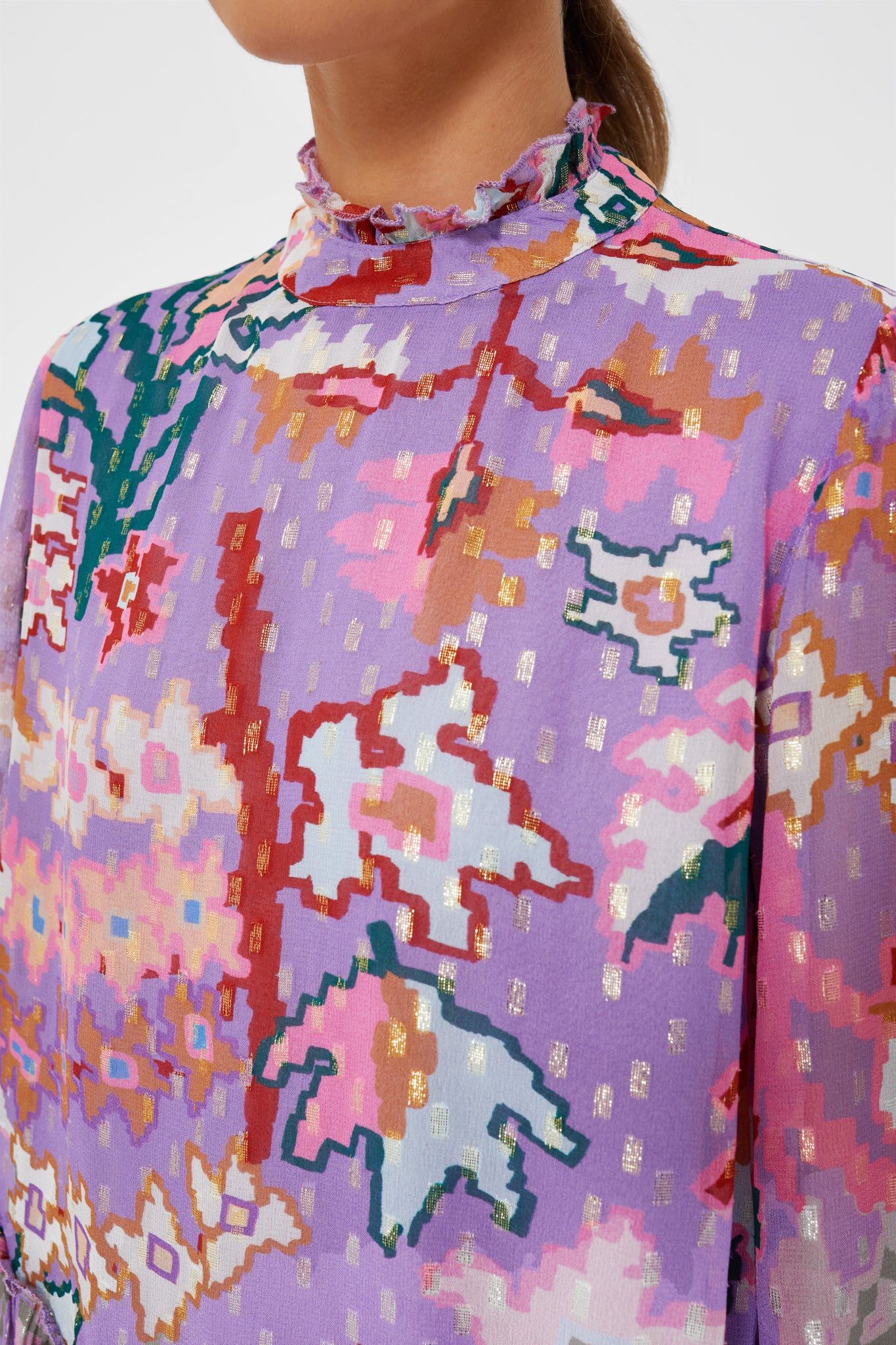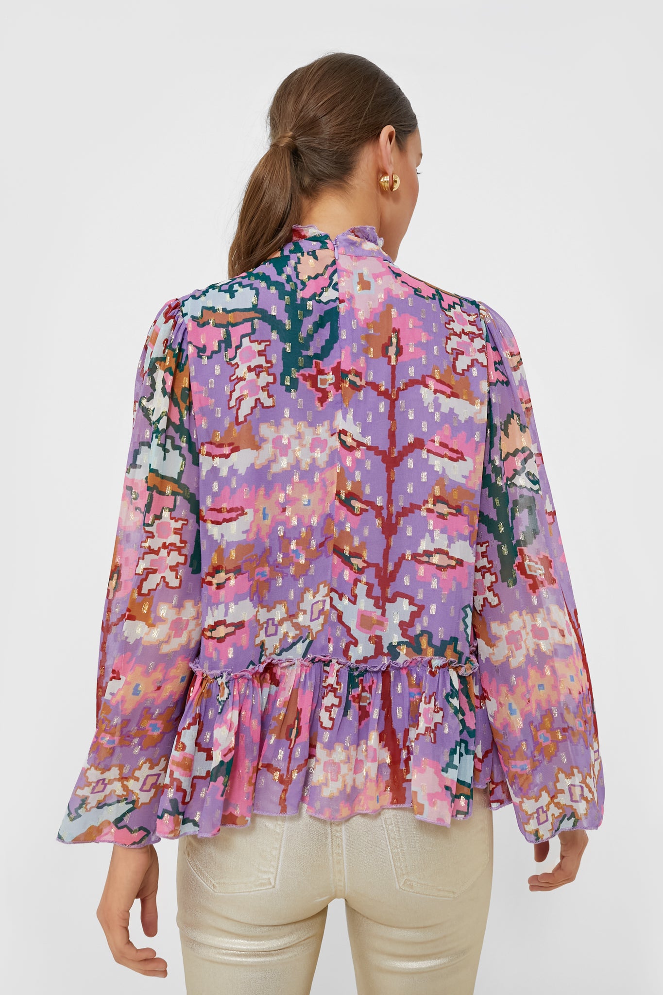 Brighten any day by throwing on the Bukhara Peplum Blouse. Bursting with color. textured fabric. and a playful design. this top is eye-catching while still being elegant and versatile. The lightweight fabric ensures comfort. while the ruffle collar and hem add dimension and character. Style this with dark green pants and white sneakers. or with off-white trousers and statement earrings.
