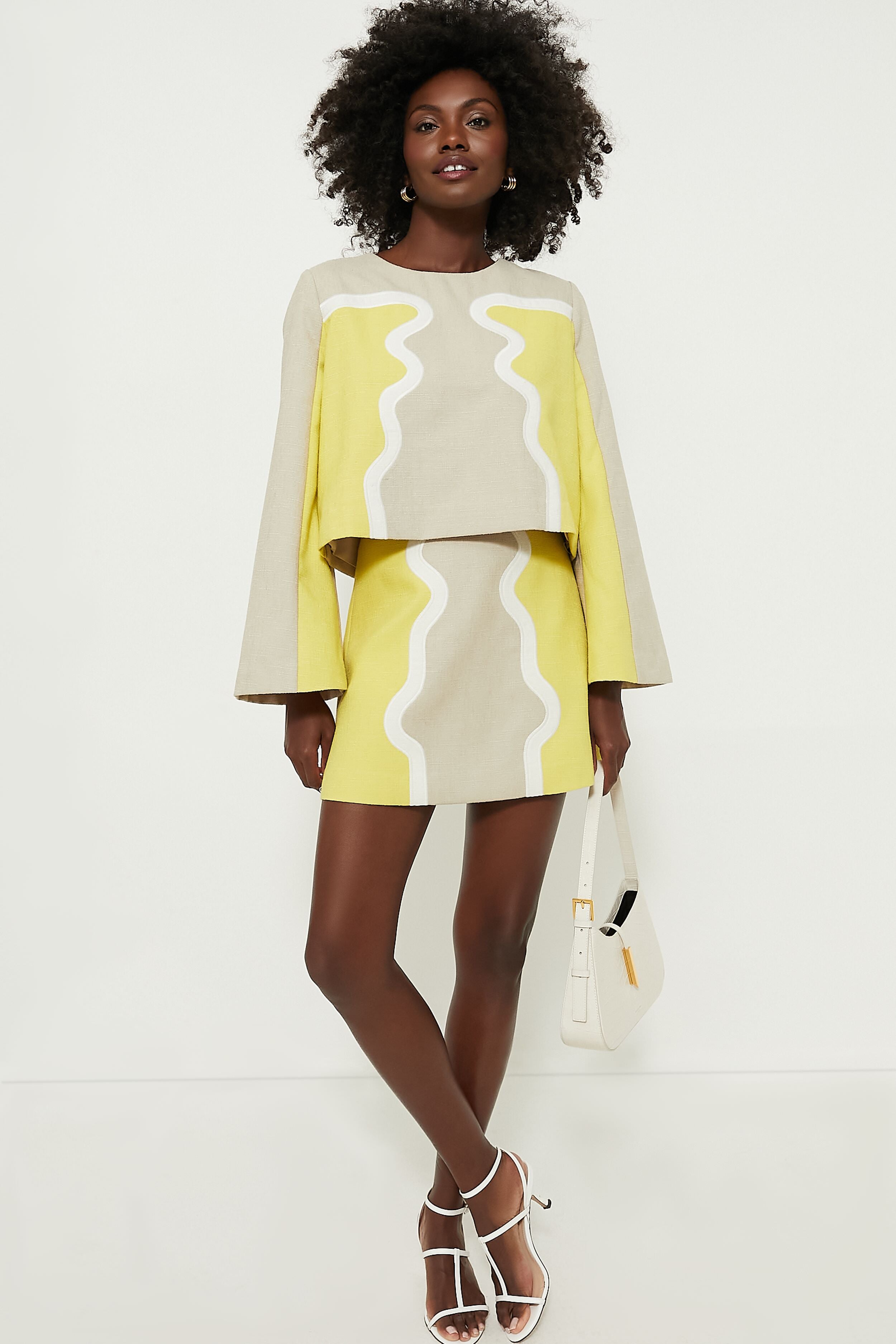 Add a vibrant. citrusy touch to your wardrobe with the Lemondrop Maxine Top. This eye-catching style is filled with details that we love. The long bell sleeves. wavy colorblocking. and boxy silhouette are equal parts feminine and playful. Pair with white sandals and the matching Lemondrop Meg Mini Skirt for a chic summertime look.