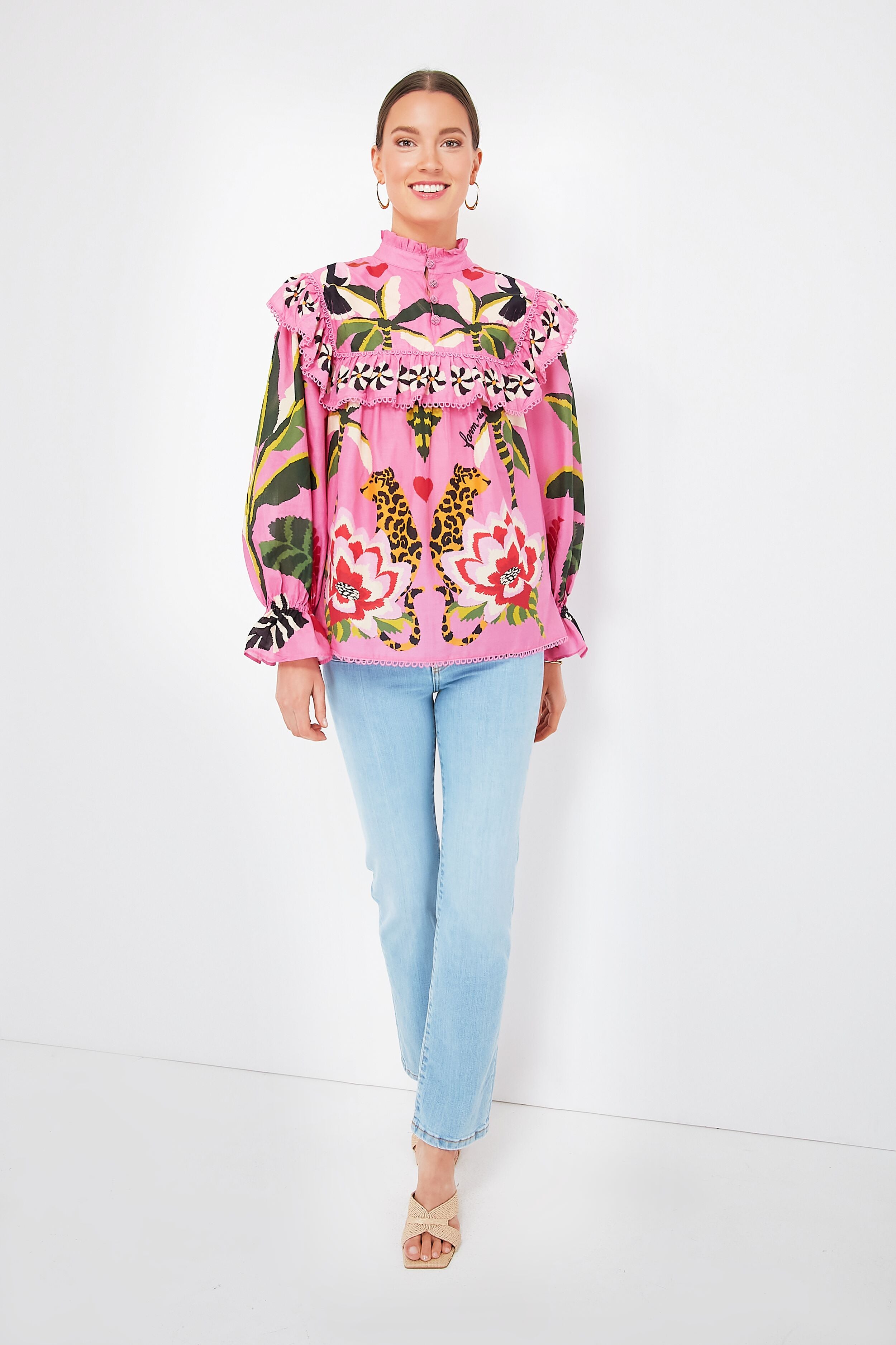 Bright. bold. and beautiful — the Leopard Forest Pink Blouse is an instant mood booster. Bringing nature-inspired elements and vibrant colors. this statement top is made for everything from from brunch with your friends to fun nights out (and all cool situations in between!). It features cute beaded buttons. darling picot trim. and a ruffled overlay to match pretty much all your bottoms. We are partial to adding statement jewelry for a big look. but it looks just as chic with subtle gold accents.