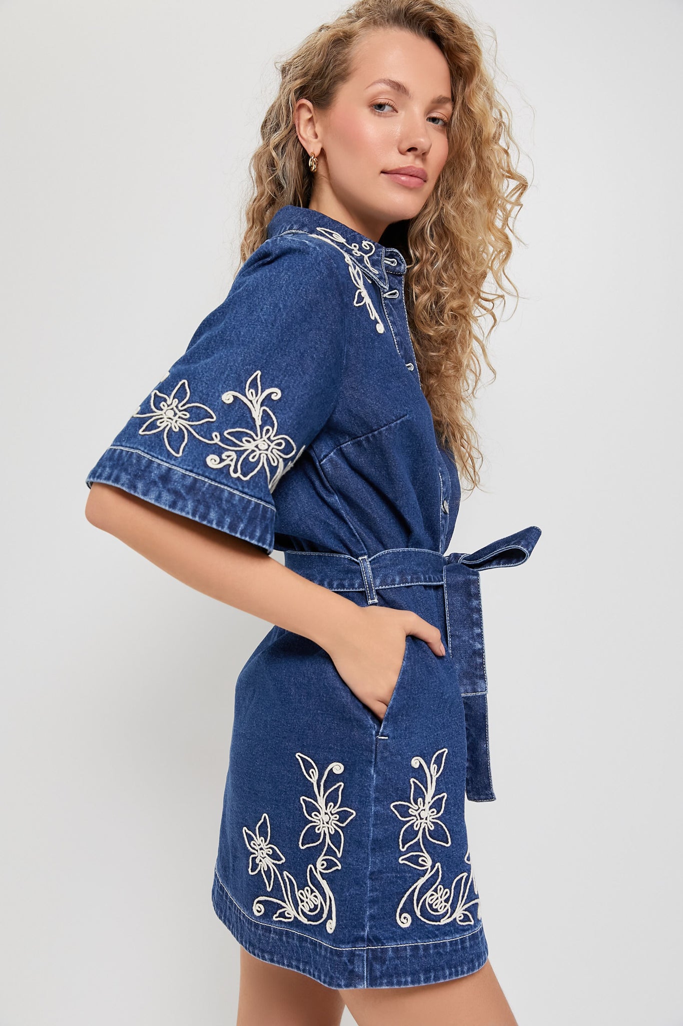 The Light Blue Carmen Mini Dress is walking artwork. with beautiful floral embroidery. wide sleeves and self-tie waist belt. Perfect for luncheons and date nights. we are styling this with boots and a shoulder bag.