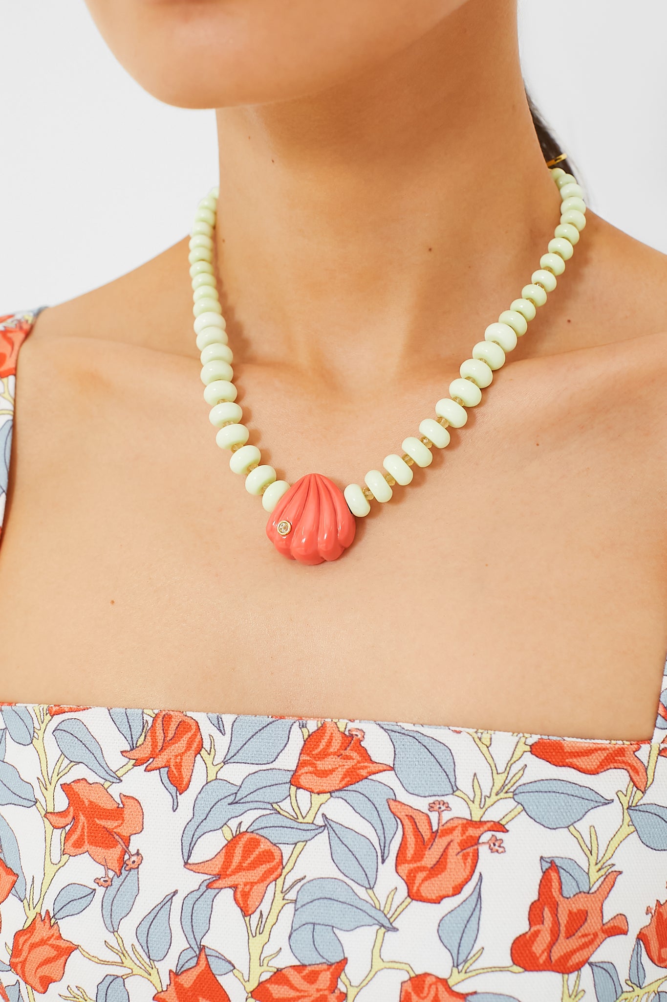 Light Green Sebastian Necklace is serving up major mermaid-chic vibes. With graduated lemon chrysoprase and dotted faceted citrine beads and coral-colored carved clamshell focal set with semiprecious sky blue topaz. this gold-plated collar is the kind of accessory your friends are going be jealous of. Pair with floaty floral dresses. easy tees and tanks. or a coverup — this style can be dressed up or down endlessly.