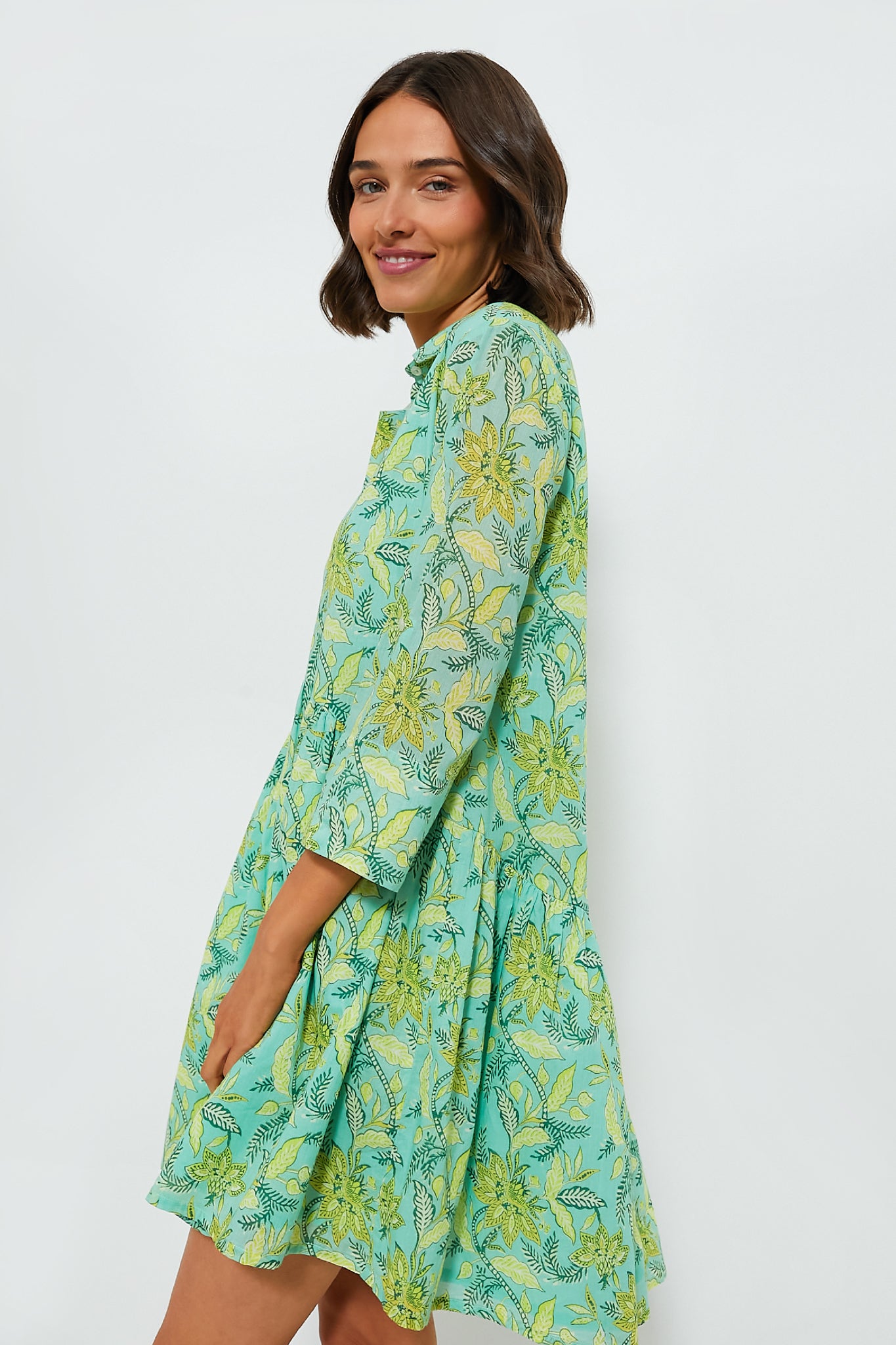 The Light Green Tenango Deauville Dress showcases a bright and breezy print in a palette of stunning greens paired with an easy cotton silhouette. With a collared V-neckline. three-quarter length sleeves. and a flounce skirt. this is a comfortable and fun warm-weather style. Grab your sandals and raffia accessories for a chic day on the town!