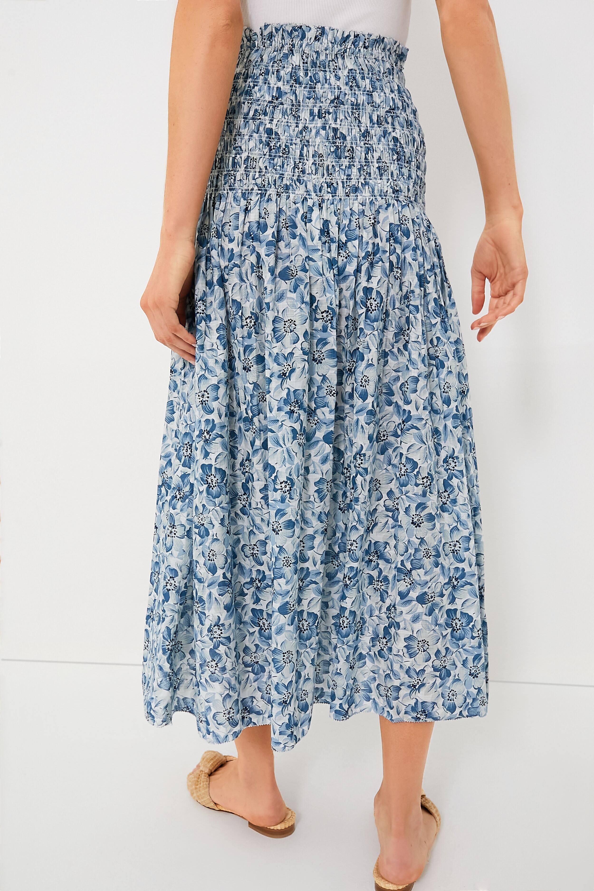 Introducing The Knoll Skirt—a pull-on style featuring an elegant. wide smocked waistband for a snug fit that releases into a sweeping hemline just above the ankle. The delicate ruffled waist edge is adorned with a picot embroidery stitch for added detail and charm. We are pairing this with a white tank or with the matching Light Sky Pressed Floral Print The Wren Top for a seamless set.