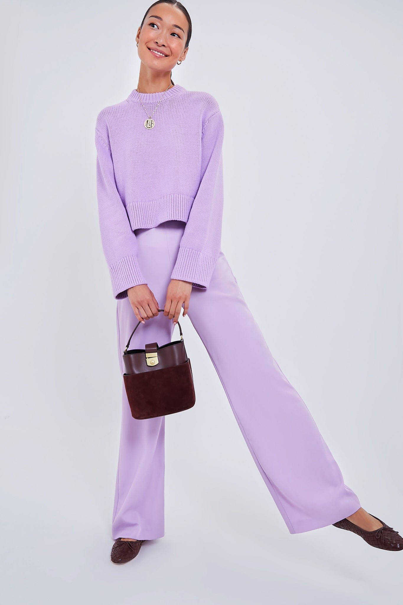 The Lilac Aiden Sweater is a perfect style for year-round wear. Flattering details include the slightly cropped length. ribbed borders. and relaxed fit. The sweet light purple is our favorite part- pair with denim and booties in the winter. and a mini skirt and sandals in the summer!