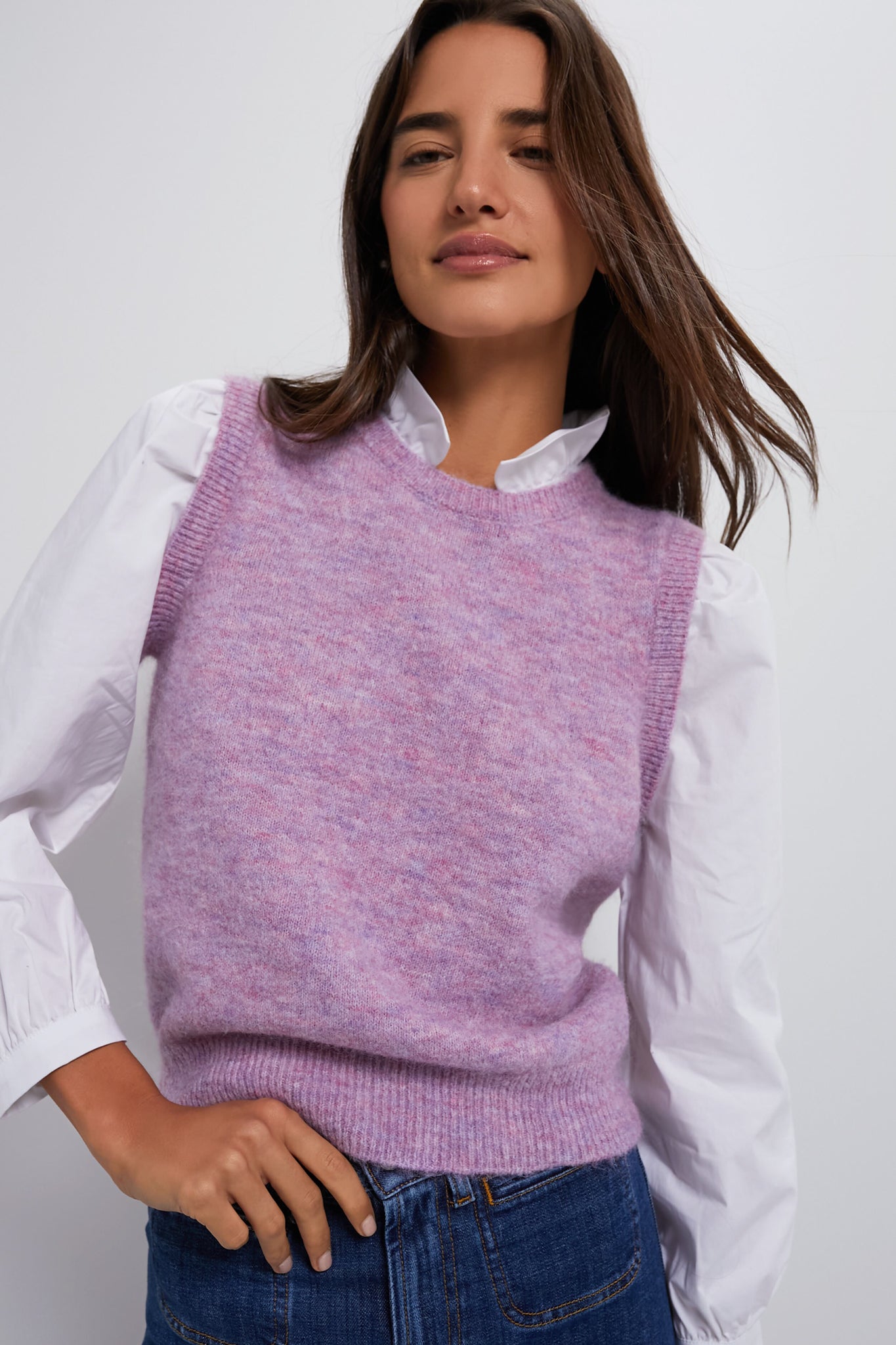 The Lilac Ella Sweater Blouse combines two styles by taking a chic sweater vest and adding classic details such as a ruffle collar and crisp white puffed sleeves. A style that you can wear all year long. we are pairing it with a mini skirt and ballet flats in the warmer months. and with denim in the cooler seasons.