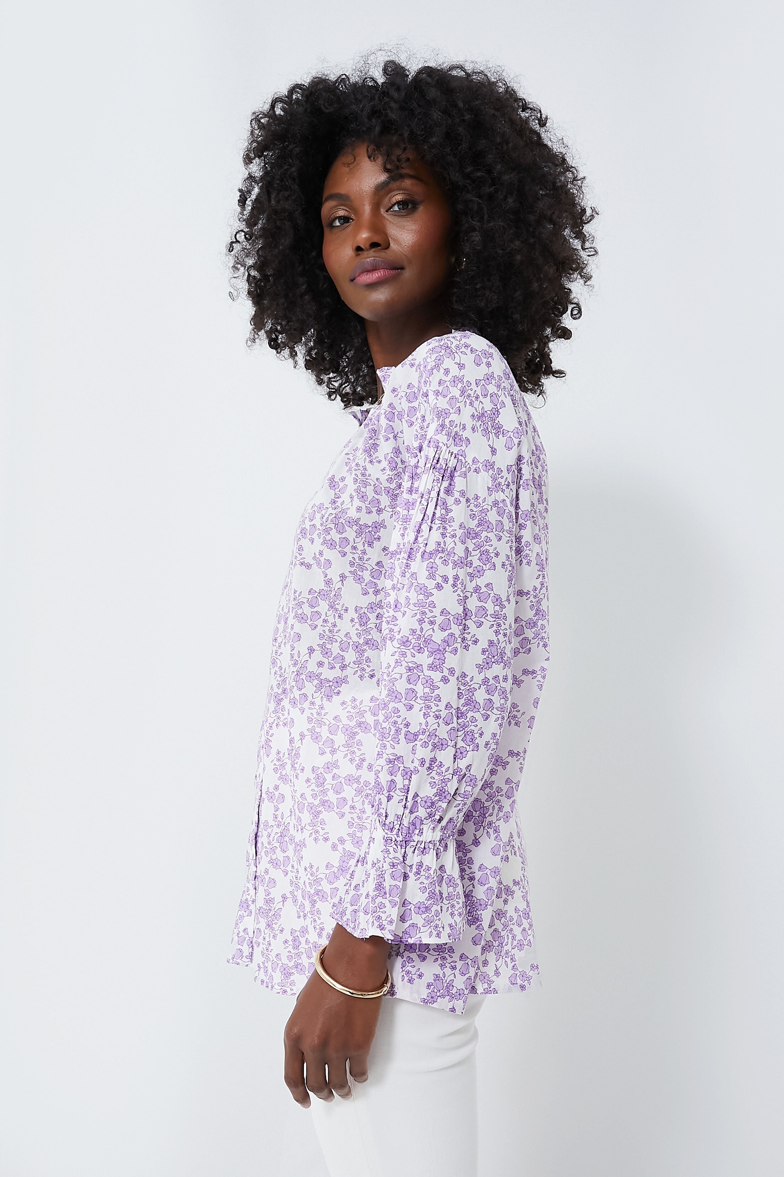 In that perfect pale purple and white color palette we all love for this time of year. the Lilac Lucrecia Rachel Shirt is effortless and exudes relaxed femininity. A ruffled collar and cuffs provide a hint of maximalism that complements the simple button down placket and rounded hem and makes this top feel extra special. Pair with any shade of denim. as well as sandals or sneakers — this summer style staple looks good with anything.