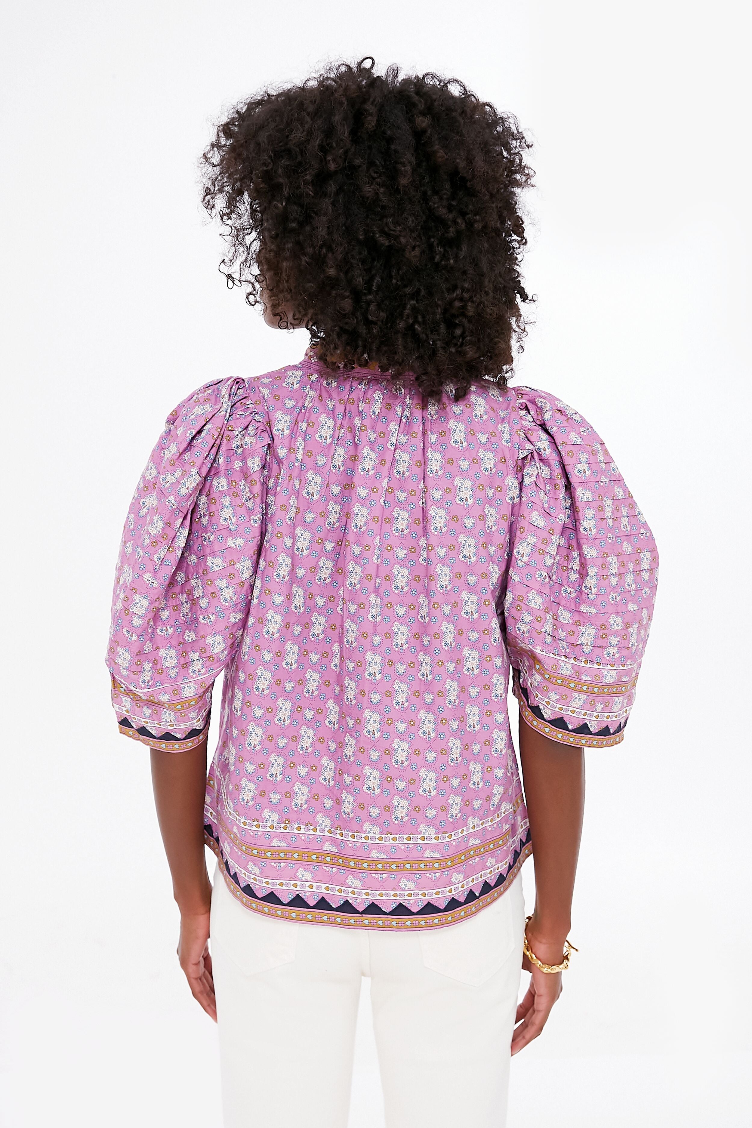 We are loving the girly. bohemian vibes of the Lilac Perry Border Top—think a lace-up front with tassel ties and sleeves with pintucked pleats and puffed shoulders. A bit of contrast in the pattern at the bib and trim around the hem makes this a stand-out style with plenty of color and print to go around. This blouse looks fabulous with white denim and ballet flats for a lighter look. or with dark denim and leather boots to transition into a new season.