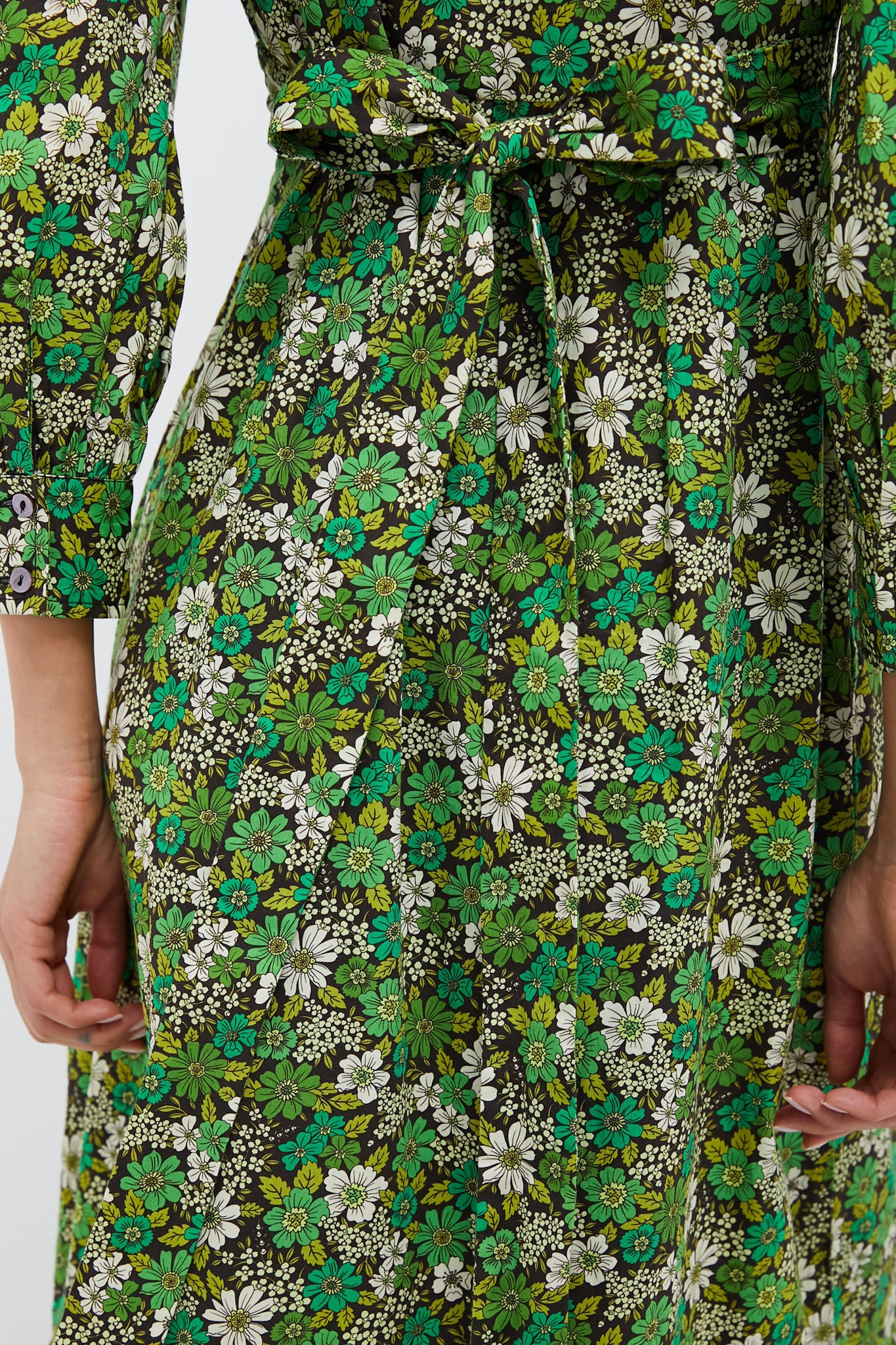 Shake up your style with this Petworth Dress in a retro Lime Ditsy print. Featuring a ruffled high neck. fitted bodice. and vintage tones of green and brown this timeless piece will be worn again and again. We recommend pairing with a brown ballet flat and suede cross body!