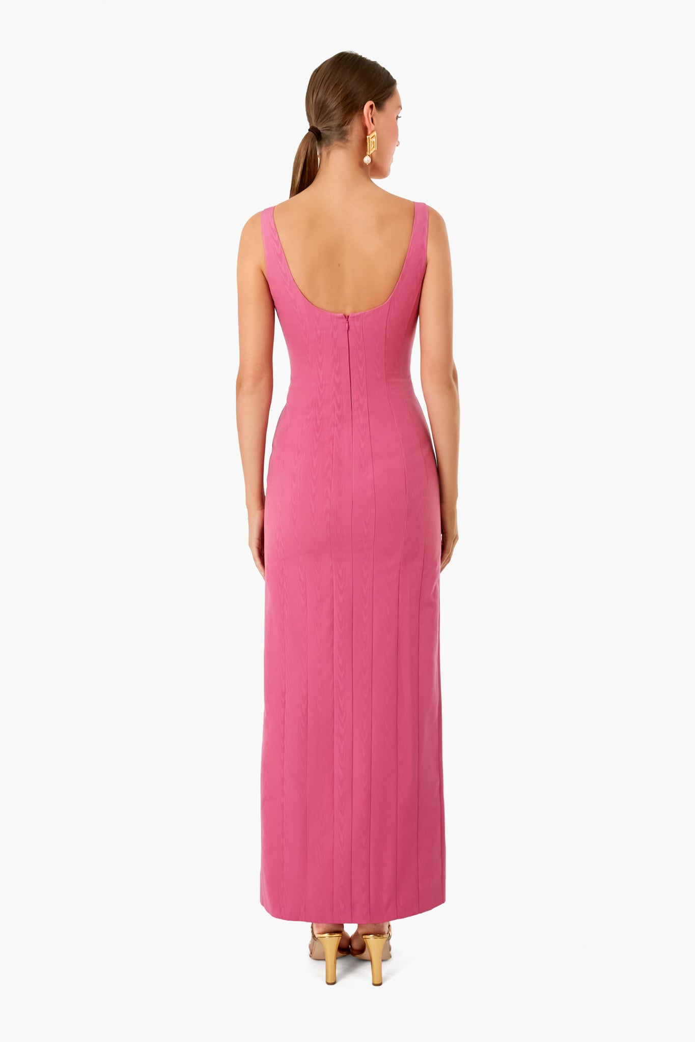 The Lollipop Portrait Dress is a sleeveless column maxi made out of a woodgrain-embossed moire fabric. Featuring a thigh high slit and bodice seaming. this feminine number exudes a bold. playful glamorous feel. We are wearing this fun bubblegum stunner to every event on our social calendar this season. just add heels and gold accessories for a vibrant standout look.
