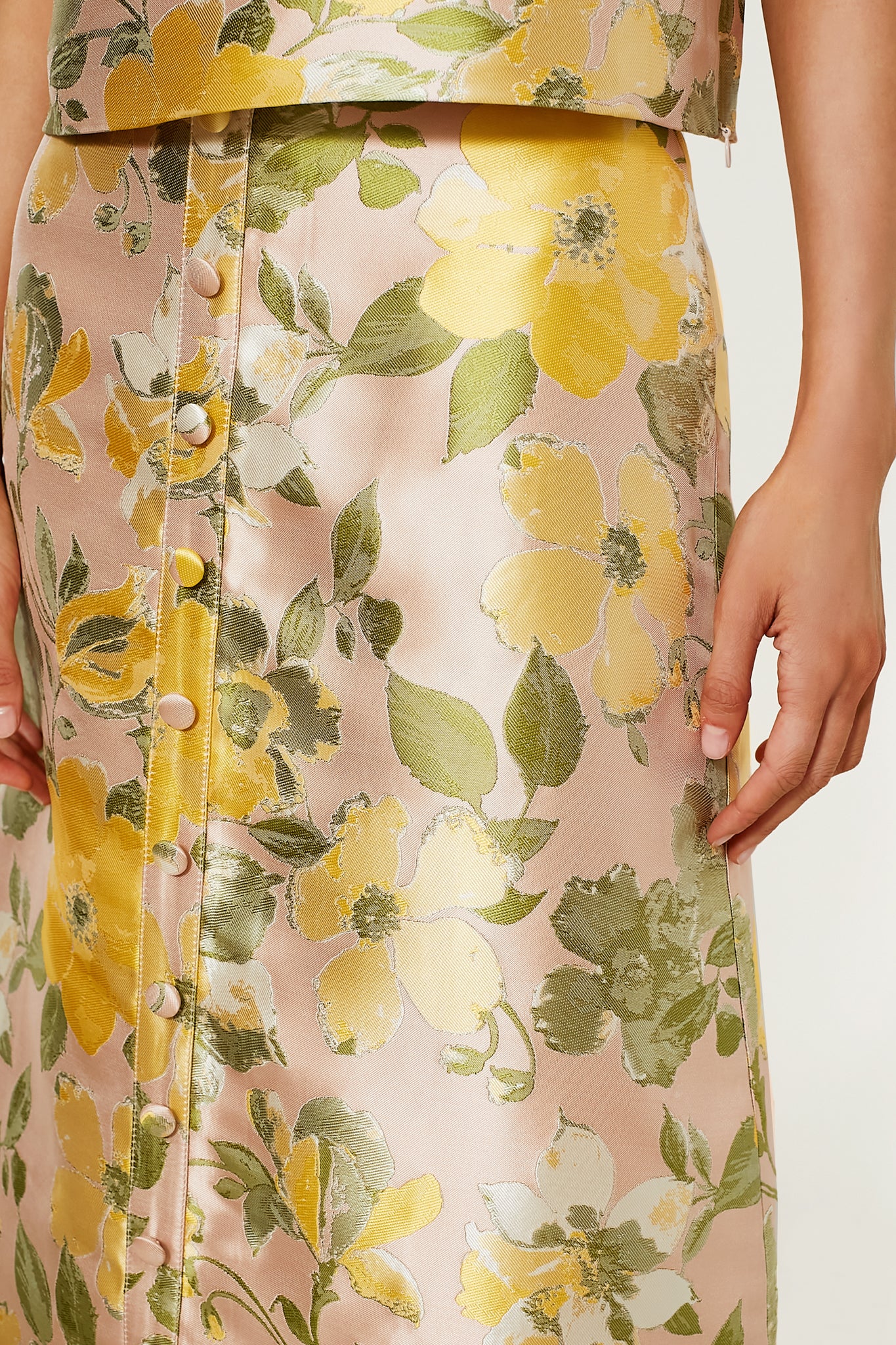 The Lotus Jacquard Thea Blouse is a floral feminine dream perfect for any lady luncheon. Featuring a jacquard texture. puff short sleeves. and keyhole back closure this number will brighten everyone's day. Pair as a matching set with the Lotus Jacquard Adalyn Skirt and gold heels or with white jeans and tie up sandals for brunch!