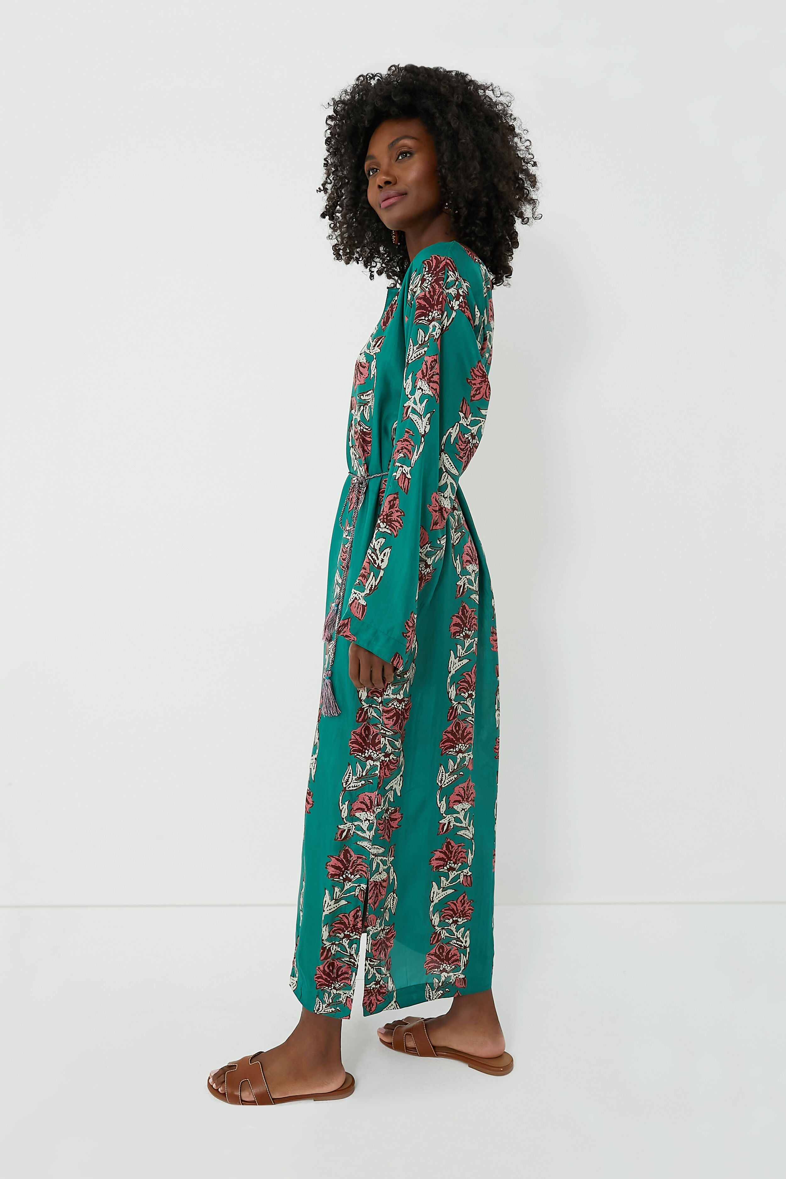Slip right into the Lotus Stella Kaftan! Hand-dyed and blockprinted by artisans in India. this flowy. '70s-inspired silhouette features a split neckline. an optional belt which can be used to cinch the waist. and side slits at the hem for easy movement. In a striking green hue. this piece stands out from the crowd and is great for on-the-go. Style with crisp white sneakers. hoops. and a shoulder bag for vacation travels. or pair with strappy sandals and sunnies for dinners al fresco.