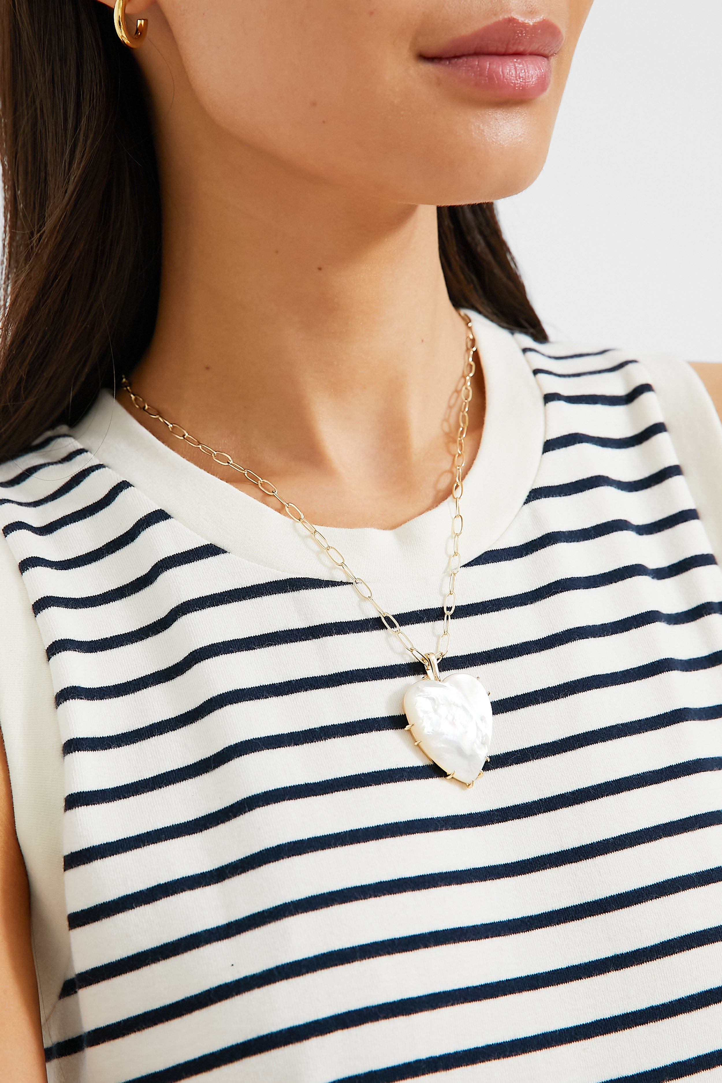 An ultra-special style. the LOVE Pendant Necklace features an oversized heart dangle made from shimmering mother of pearl. Inspired by the E.E. Cummings poem “I carry your heart. I carry it in my heart”. this piece of jewelry is overflowing with adoration. and finished with both a chic claw prong setting and a powerful love coin motif on the back side. A perfect complement to any look from glitzy gowns to classic denim. this is sure to be worn on repeat!