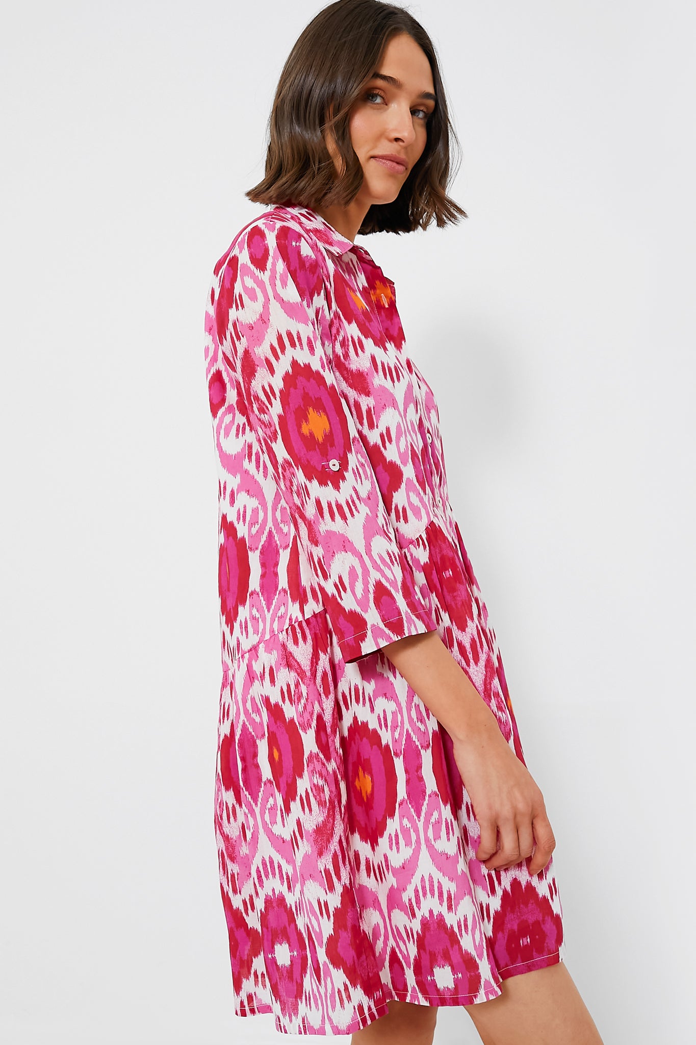 The Magenta June Deauville Dress showcases a bright and bold print in a palette of stunning pinks paired with a breezy cotton silhouette. Perfect for the days when you are manifesting warmer weather or having fun in the sun. this mini has long sleeves with button tabs to roll them up if needed. and a slightly longer back hem for a twirl-worthy silhouette. We love pairing this with white sneakers and a tote for days of exploring a new city. or with sandals and sunglasses for chilling beachside.