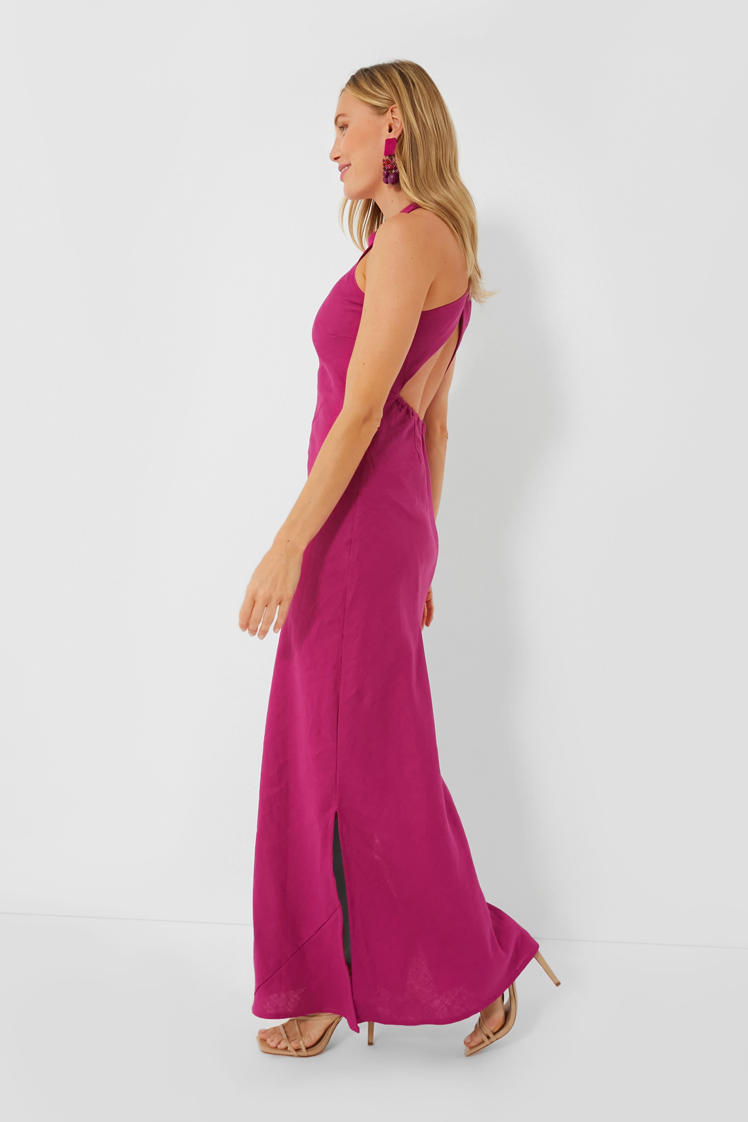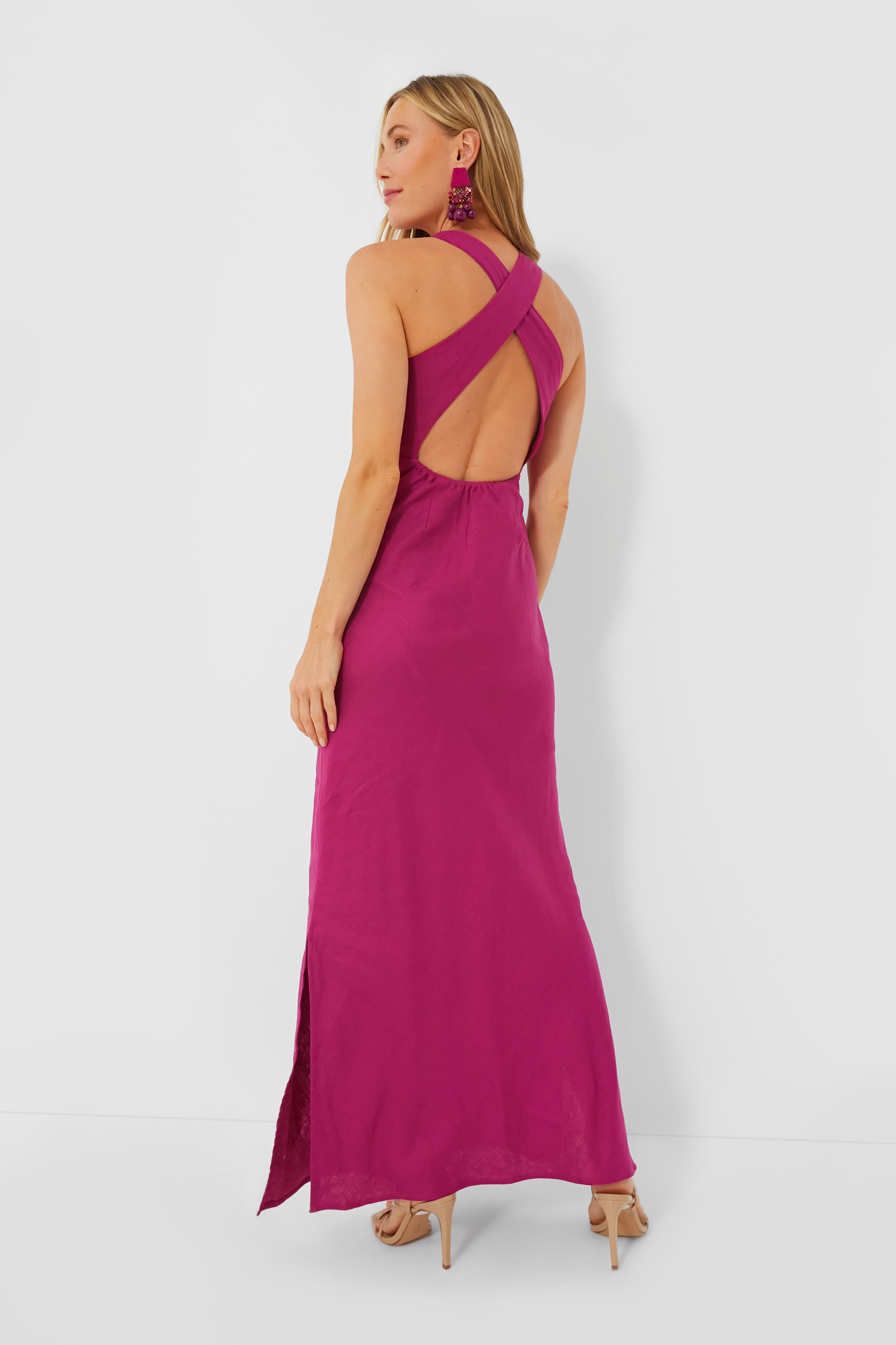 Boasting a feminine form with subtle yet statement-making details. the Magenta Lobo Dress is exactly the silhouette you need in your closet for elevated occasions. Cut on a bias and left unlined for a delicate drape that lightly skims the body. this style features an elegant high neckline. crisscrossing straps with a back cutout. and side slits at the hem for easy movement. Full of freshness thanks to that stunning raspberry hue and light linen fabric. this maxi pairs well with heels and a clutch for a party-ready look!