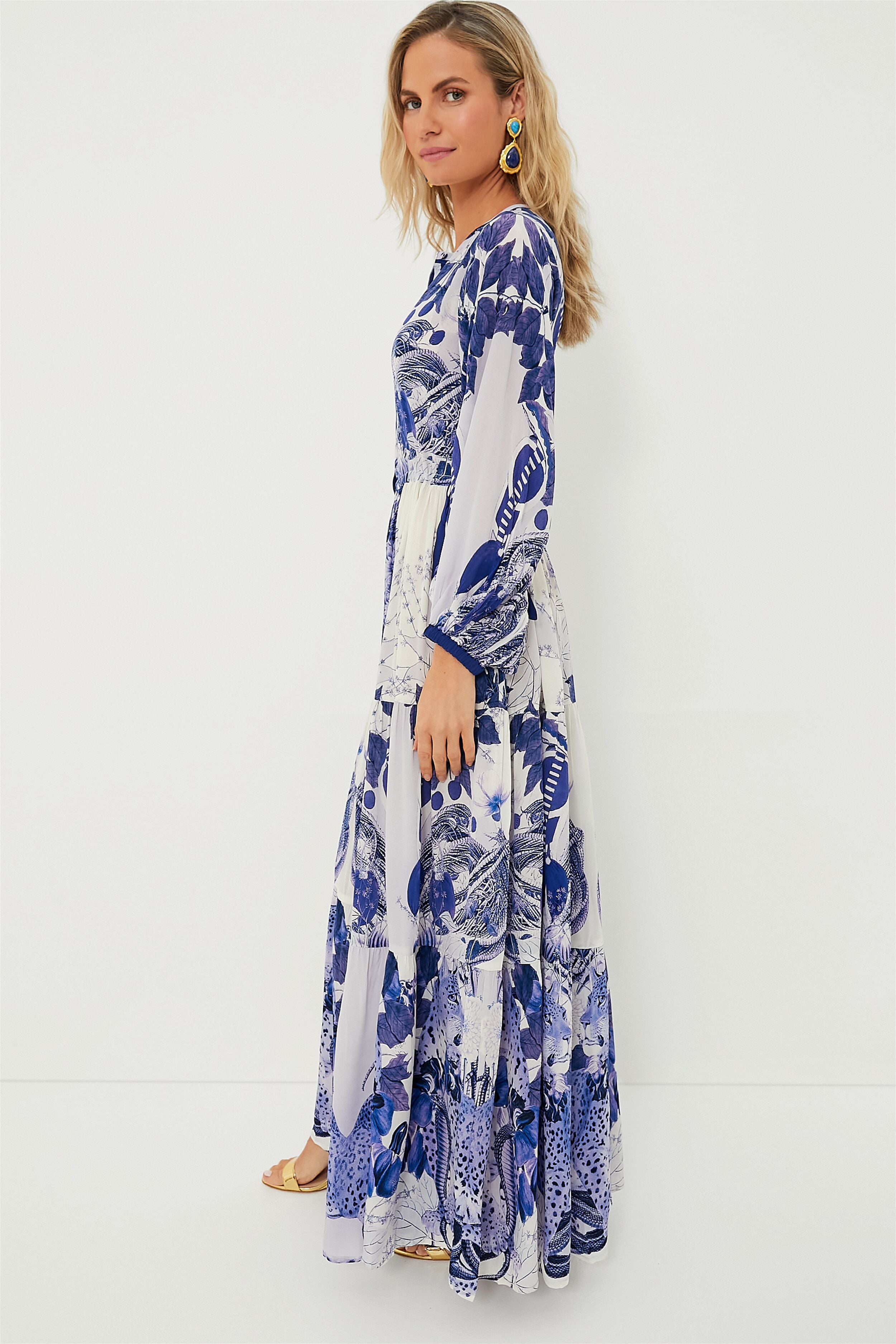Nothing feels better than finding the perfect. easy-to-wear outfit. like the Magestic Amnis Sepia Josefina Dress! Crafted from sustainable georgette with a lovely blue floral print. this maxi boasts long blouson sleeves with cuffs. full button placket and a tiered skirt that gently sways as you move. Pair it with sandals and a hat for a sunny day at the park or wear gold earrings and heels for a dinner date.