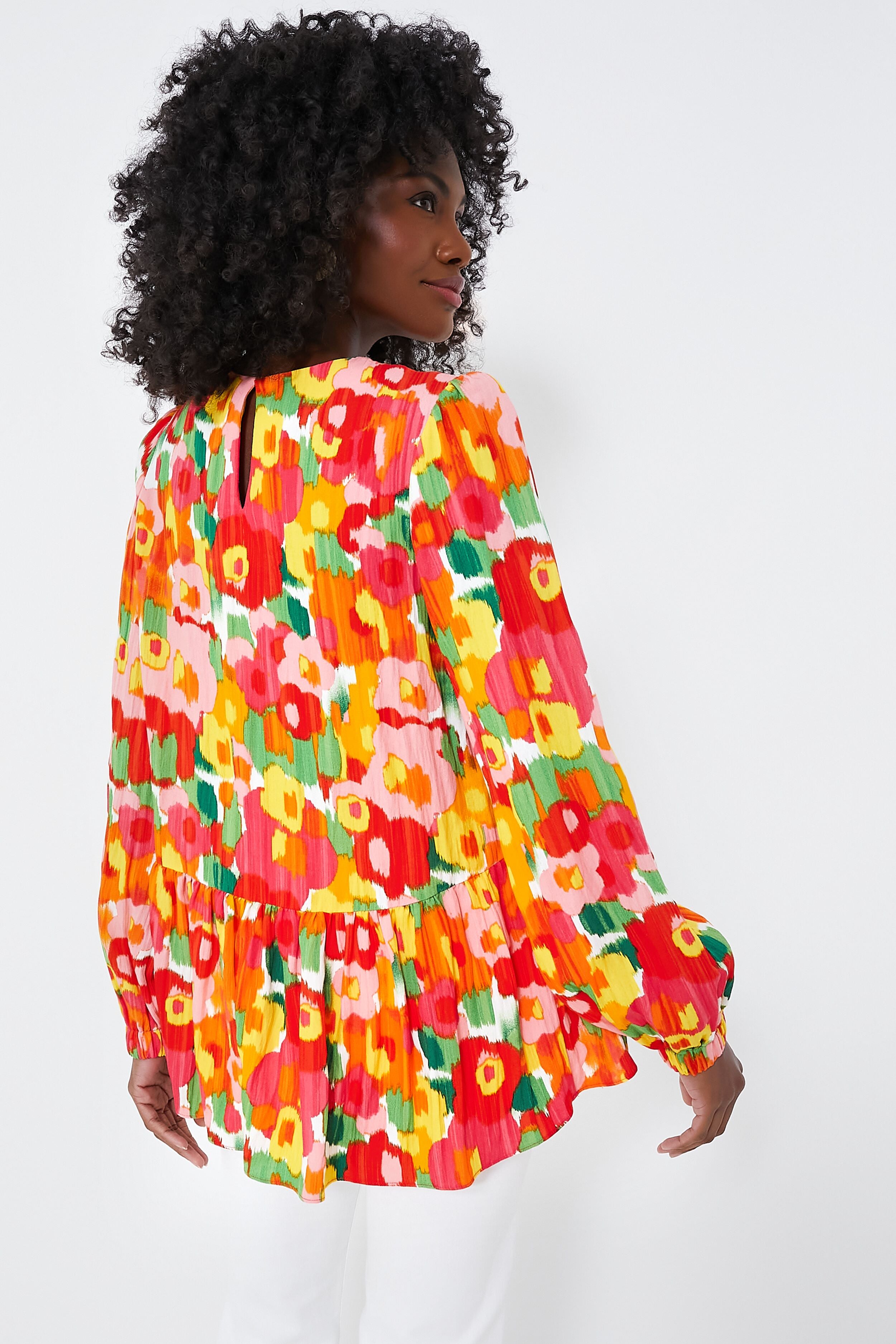 Flowy and flattering. the Magnolia Watercolor Carlota Blouse is a wardrobe must-have. This bright and blurry floral top features subtle puff sleeves with elastic wrists. keyhole button back closure. and a peplum hem finish. Pair with denim and a change of accessories for a fresh look that will take you from desk to drinks with ease!