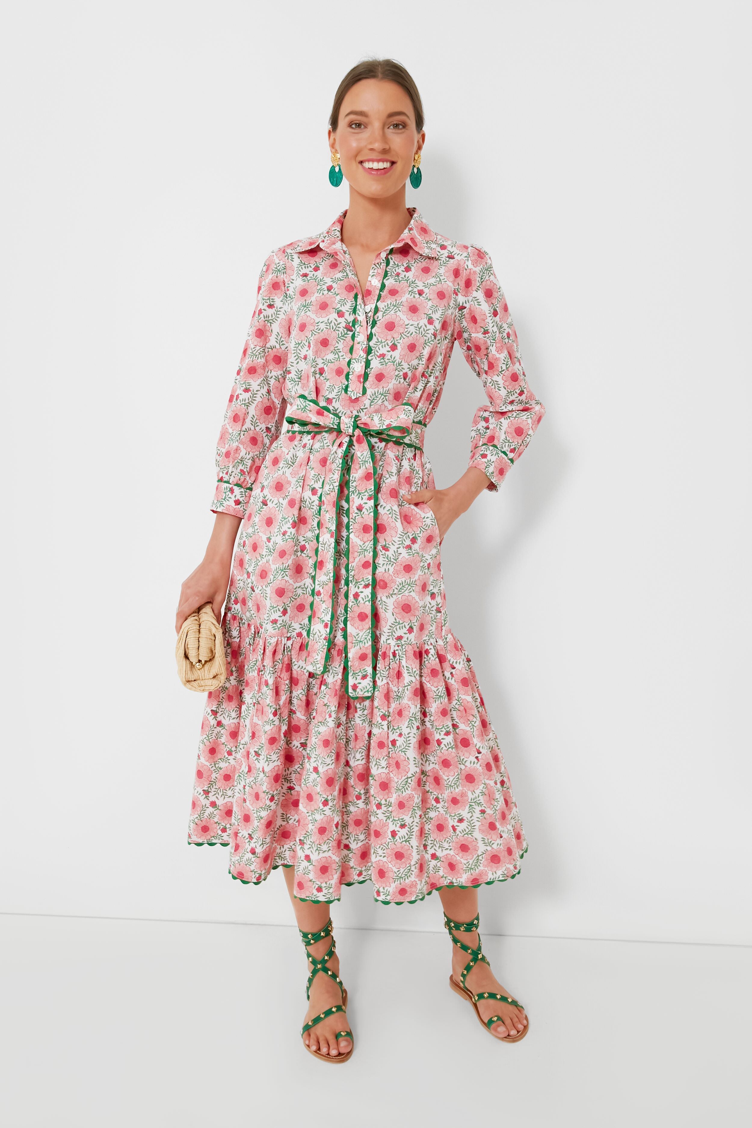 A flattering and versatile wardrobe favorite. the Marigold Blush Margot Dress is covered in the most gorgeous botanical print that will have you dreaming of frolicking in a flower field. Elegant details like a point collar. blouson sleeves with banded cuffs. and a partial button front placket are balanced with the fun addition of a verdant green ric rac trim detail scattered throughout. Wear this lovely midi silhouette loose for an effortless look. or cinch in the waist with the optional self-tie belt to dress it up for occasions and add some gold jewelry to finish off your outfit!