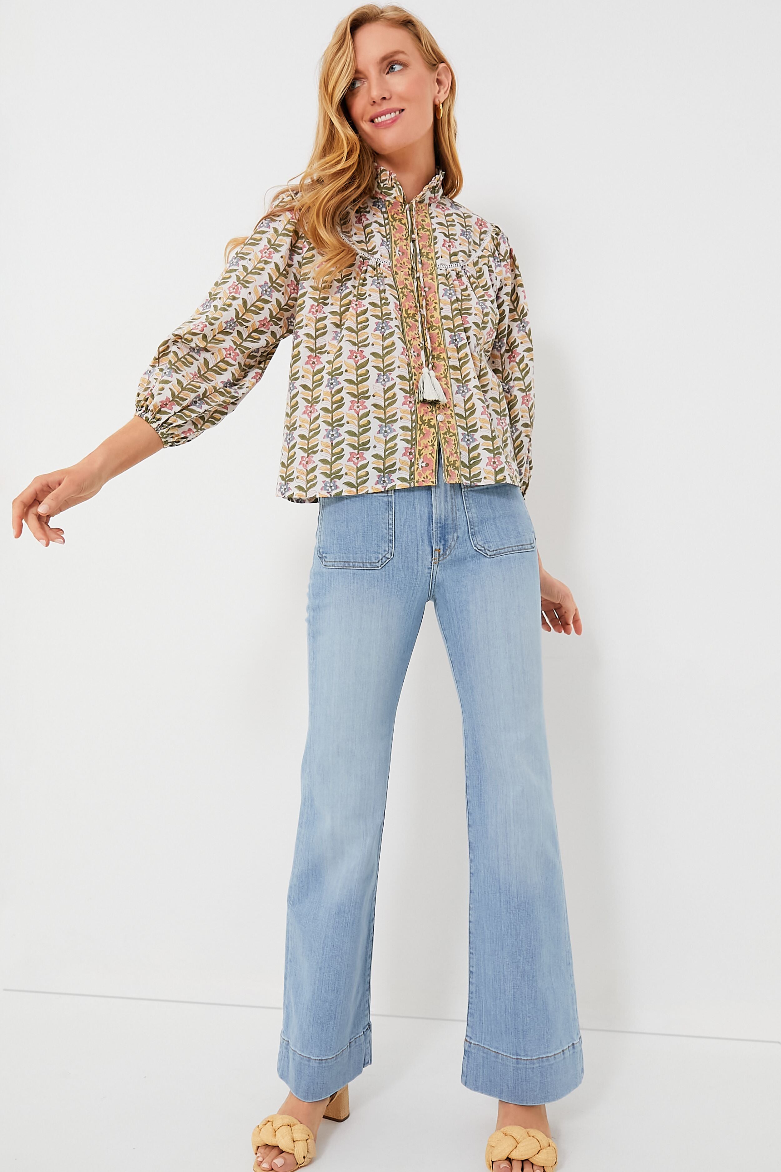 We are loving the Marigold Georgia Blouse for its floral and feminine details that make us feel like we stepped into an enchanted garden. The ruffle neckline. three-quarter length puff sleeves. and front tassel self-ties add graceful elements that complement the colorful pattern. Perfect to pair back with denim. we are styling these with everything from sneakers to ballet flats to chunky wedges!
