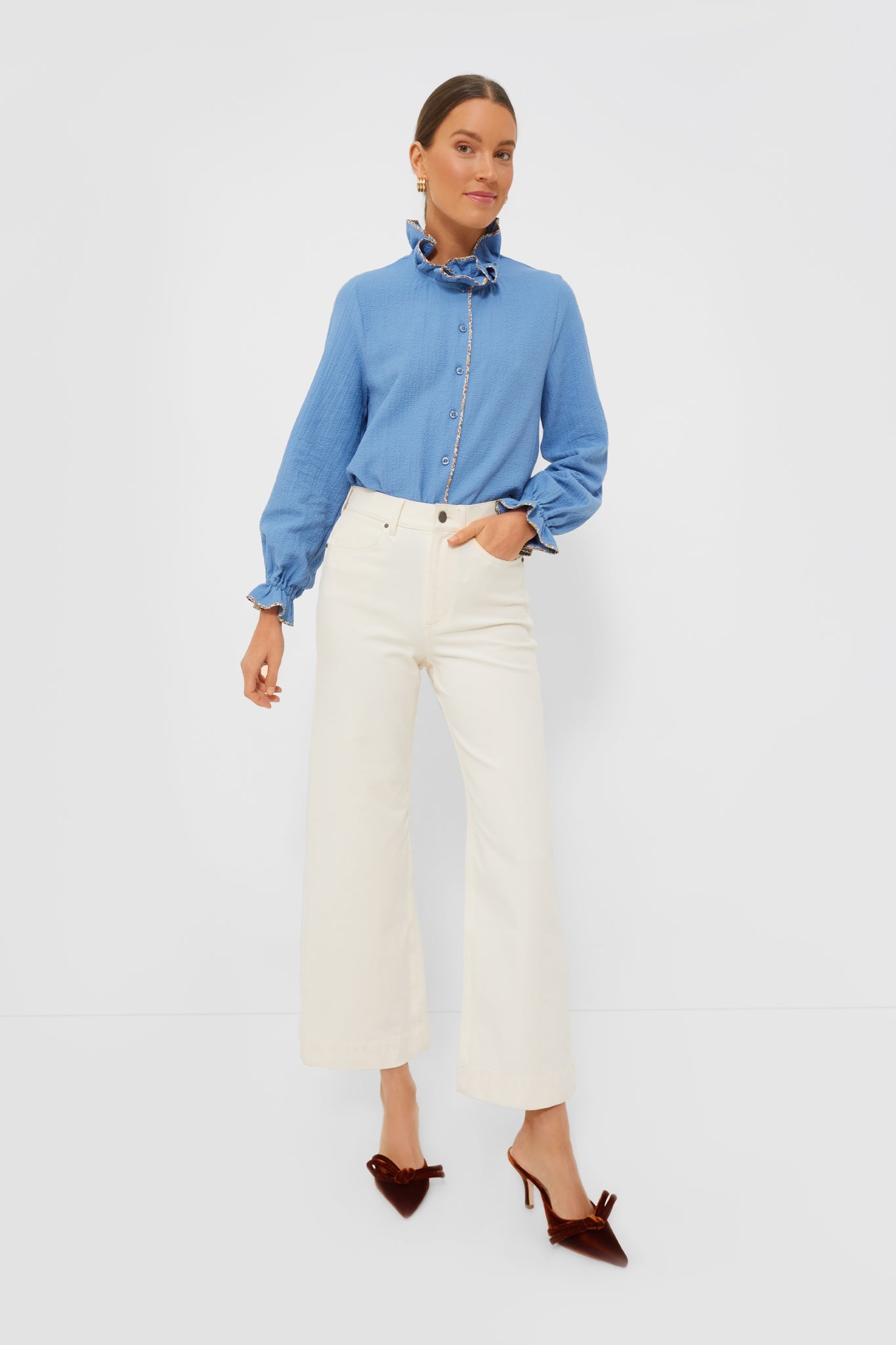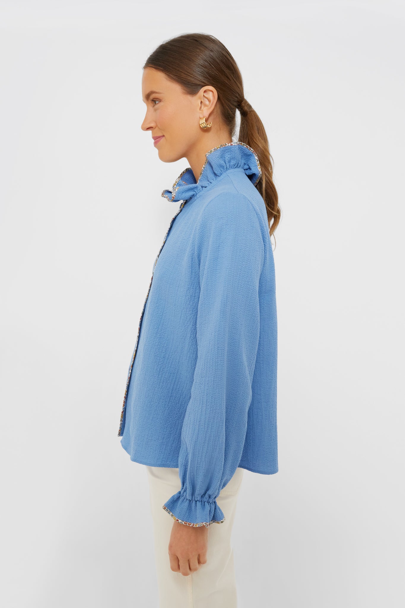 The Marisa Blue Ally Blouse delivers a timeless silhouette with beautiful delicate details. Complete with sweet floral contrast piping throughout. we love this piece for a fabulously feminine look. Perfect for the office. luncheons. and weekend wear. style with a midi skirt. flats. and gold accessories for an effortlessly elegant ensemble.
