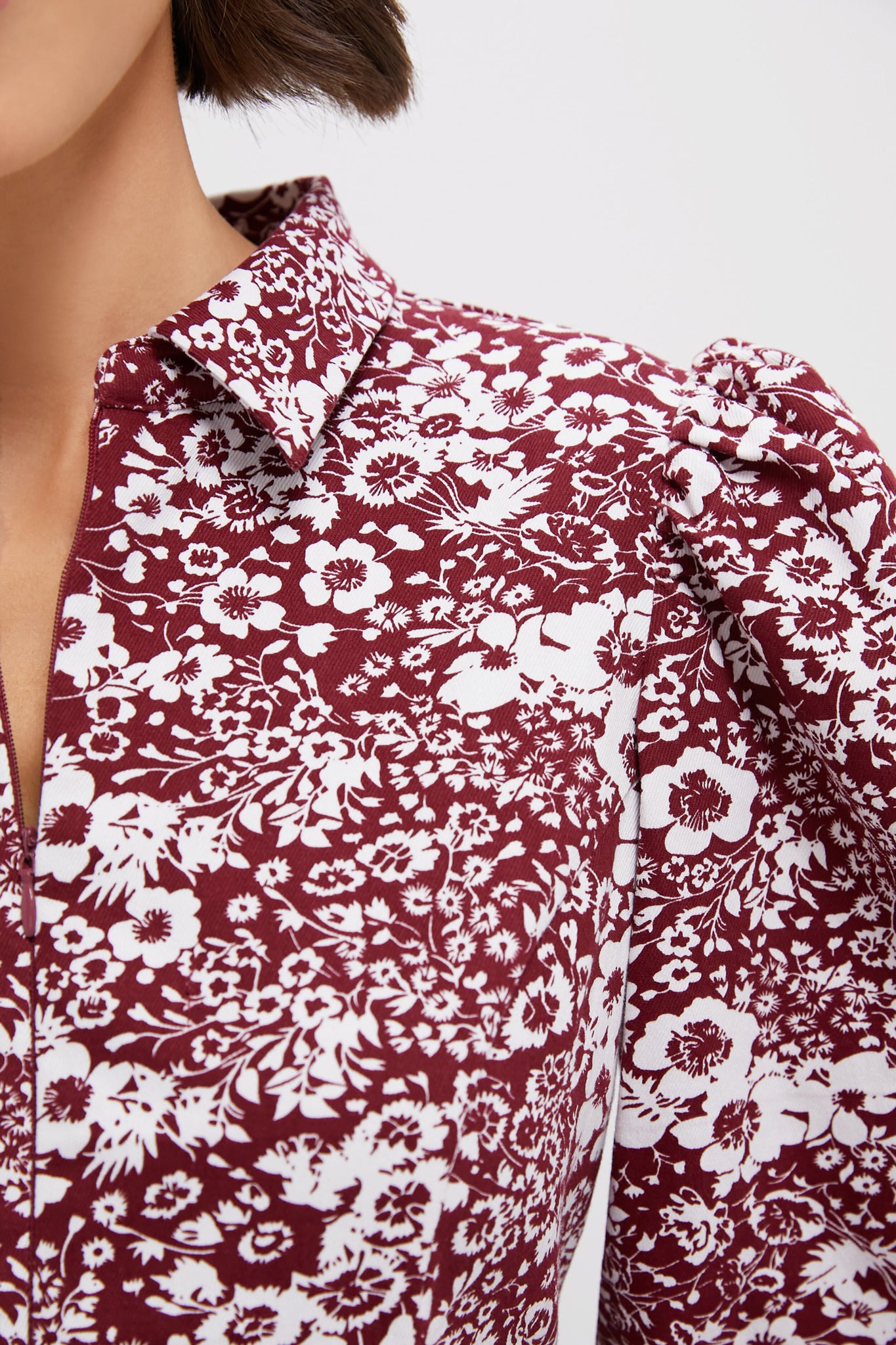 The perfect transition piece for the warm weather to the cooler months. the Maroon Floral Front Zip Begonia Mini Dress is a chic style with feminine details we love. This fit-and-flare mini boasts a collared neckline. puffed shoulders. and a stretch-denim feel that is equally luxe and comfortable. Pair with high boots and a crossbody for game day. or with ballet flats and a shoulder bag for weekend brunch.
