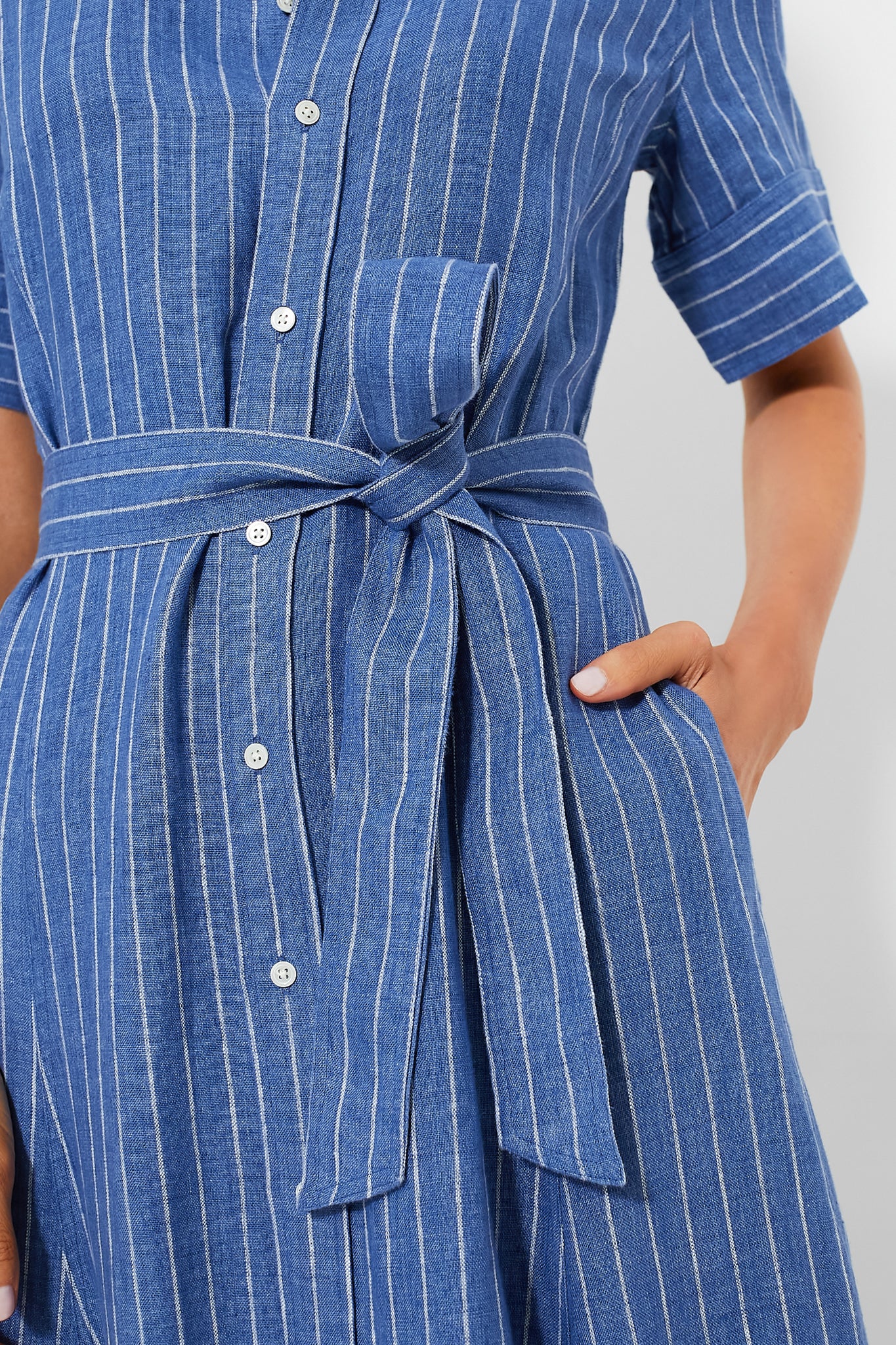 Your wardrobe just got a sophisticated upgrade with the Medium Blue and White Shortsleeve Bea Dress! Crafted with yarn-dyed striped linen. this midi-length shirtdress unites an A-line silhouette with a buttoned placket. a tiered skirt. and a self-belt. Pair with sneakers and a crossbody for weekday errands. or with ballet flats for an elevated day-to-night look.