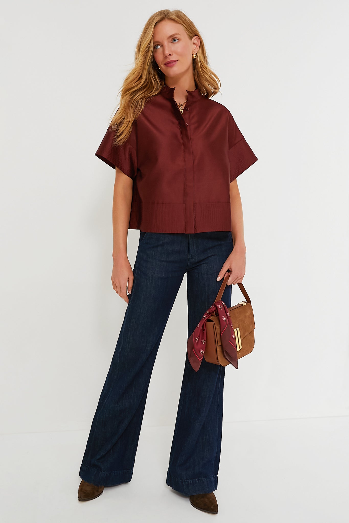 The Merlot Dupioni Trapunto Stitch Sofia Shirt is the elevated style staple your closet needs. A short sleeve button down with a slightly cropped hem and a boxy silhouette that's perfect for pairing with all kinds of bottoms. this style is finished with trapunto stitching that adds an extra-special detail to a classic look. Style with trousers and flats for the office. with a skirt and kitten heels for a dinner date. or with denim and crisp sneakers for weekend wear — this number can do it all.