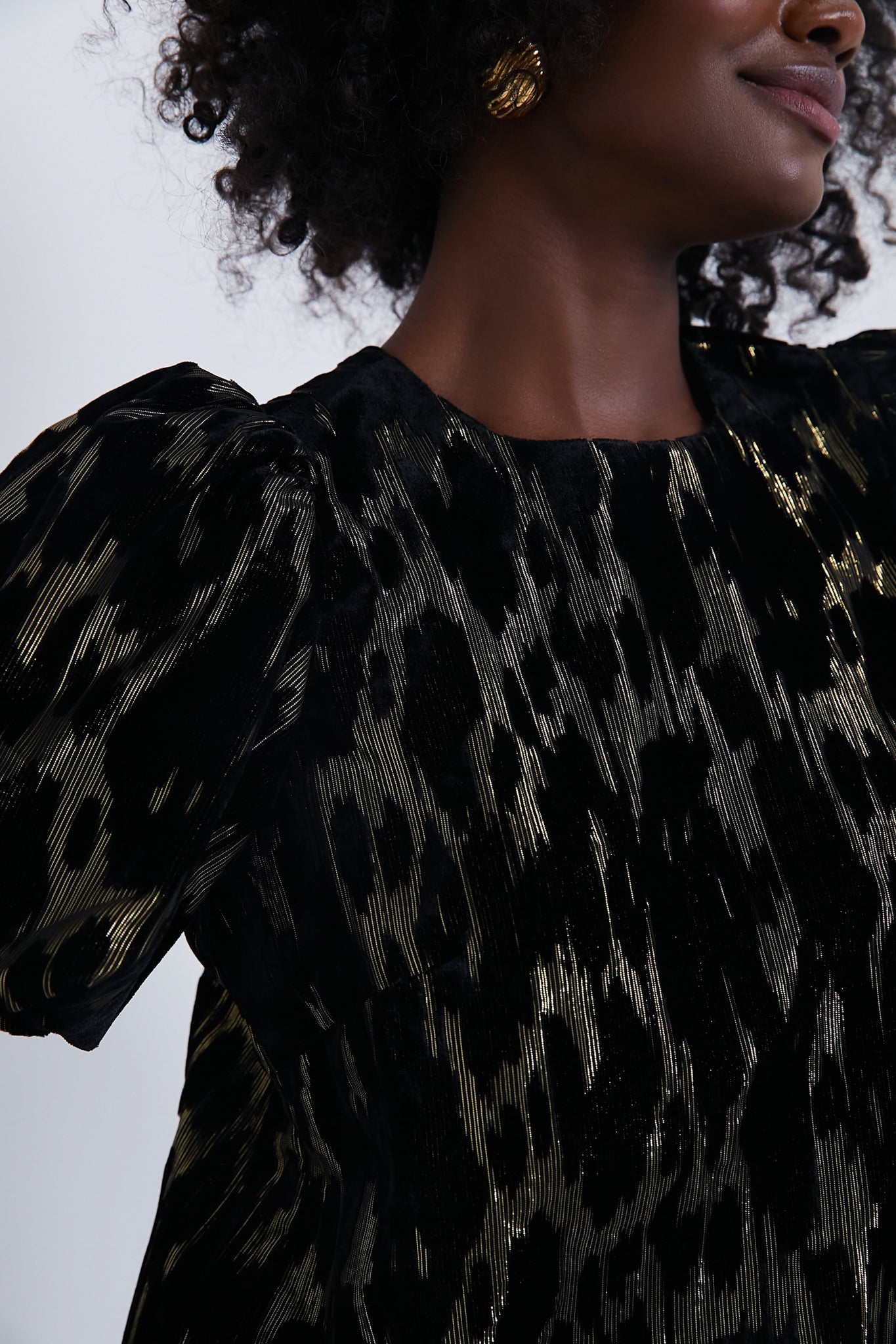 The Burnout Lyla Blouse is oh so chic. Designed with bubble sleeves for volume and a textured metallic velvet fabric that adds dimension and makes for a polished finish. this top is a guaranteed wardrobe winner. Classic-with-a-twist. just add trousers and heels for an effortlessly glamorous party look!
