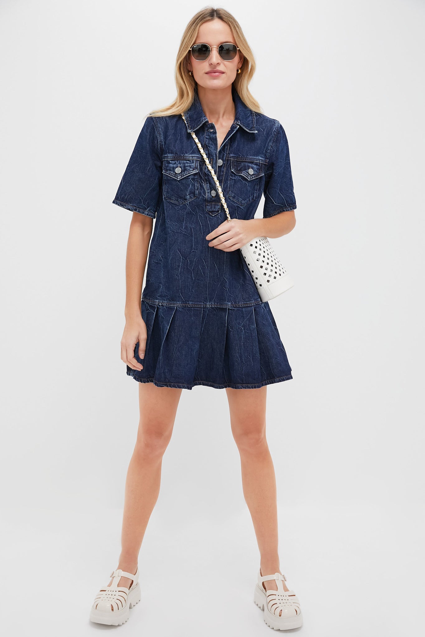 The Mid Blue Stone Crinkled Future Denim Mini Dress features a collar. button closure. short sleeves and a pleated skirt that adds shape and movement. We are styling it with ballet flats for coffee meetings or with tights and high boots for family get-togethers.