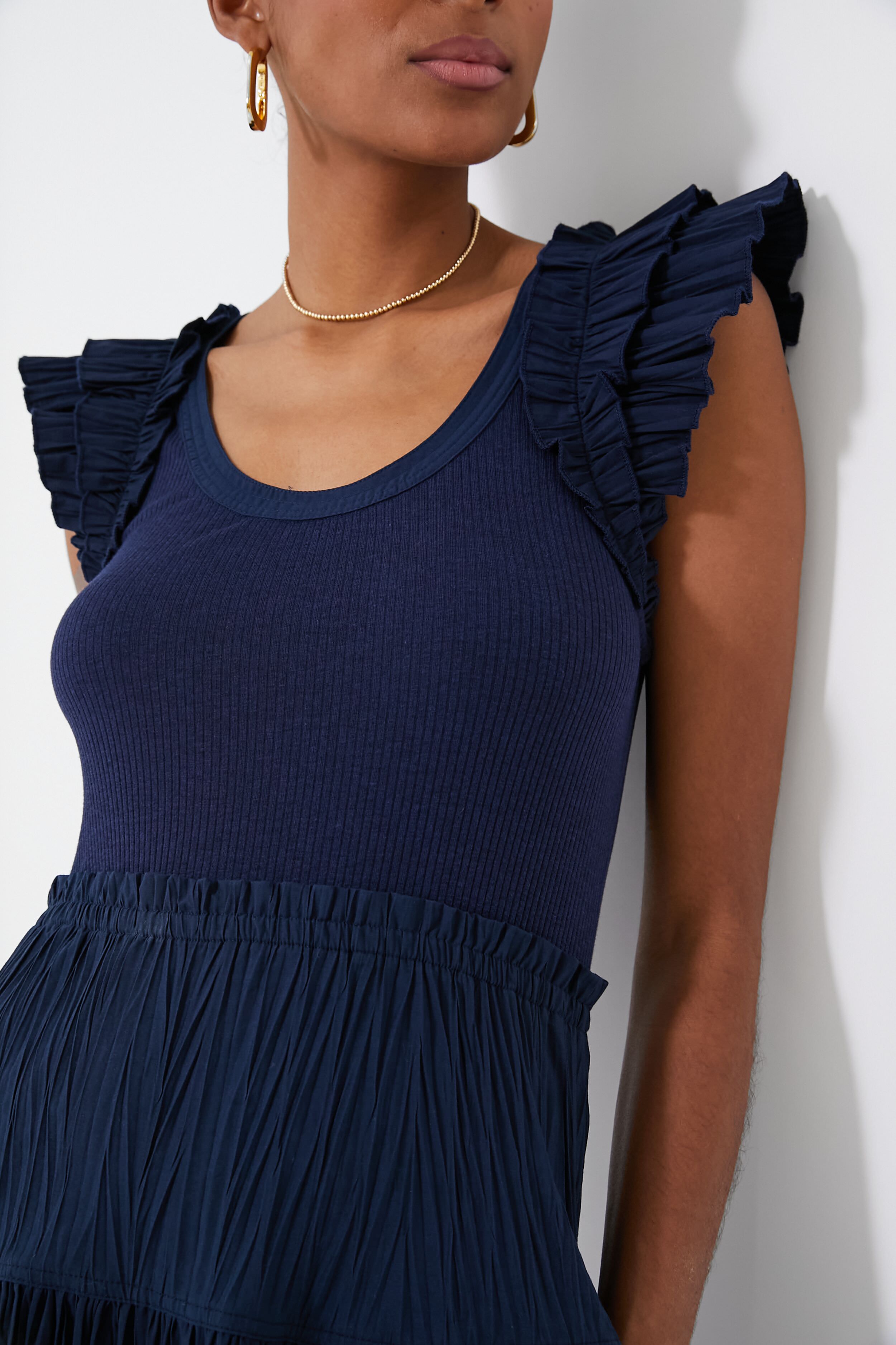Why wear a separate shirt and skirt when you can wear the Midnight Virginia Dress? This silhouette creates the illusion of a tonal set with a ribbed tank on top and a pleated cotton poplin skirt on bottom — then it is taken up a notch with layered ruffle shoulder straps for a touch of fun volume. Subtle yet dramatic in equal measure. this midi can be dressed down with sandals and sunnies to grab brunch with your besties. or can be dressed up with wedges and statement earrings for an event at the country club!