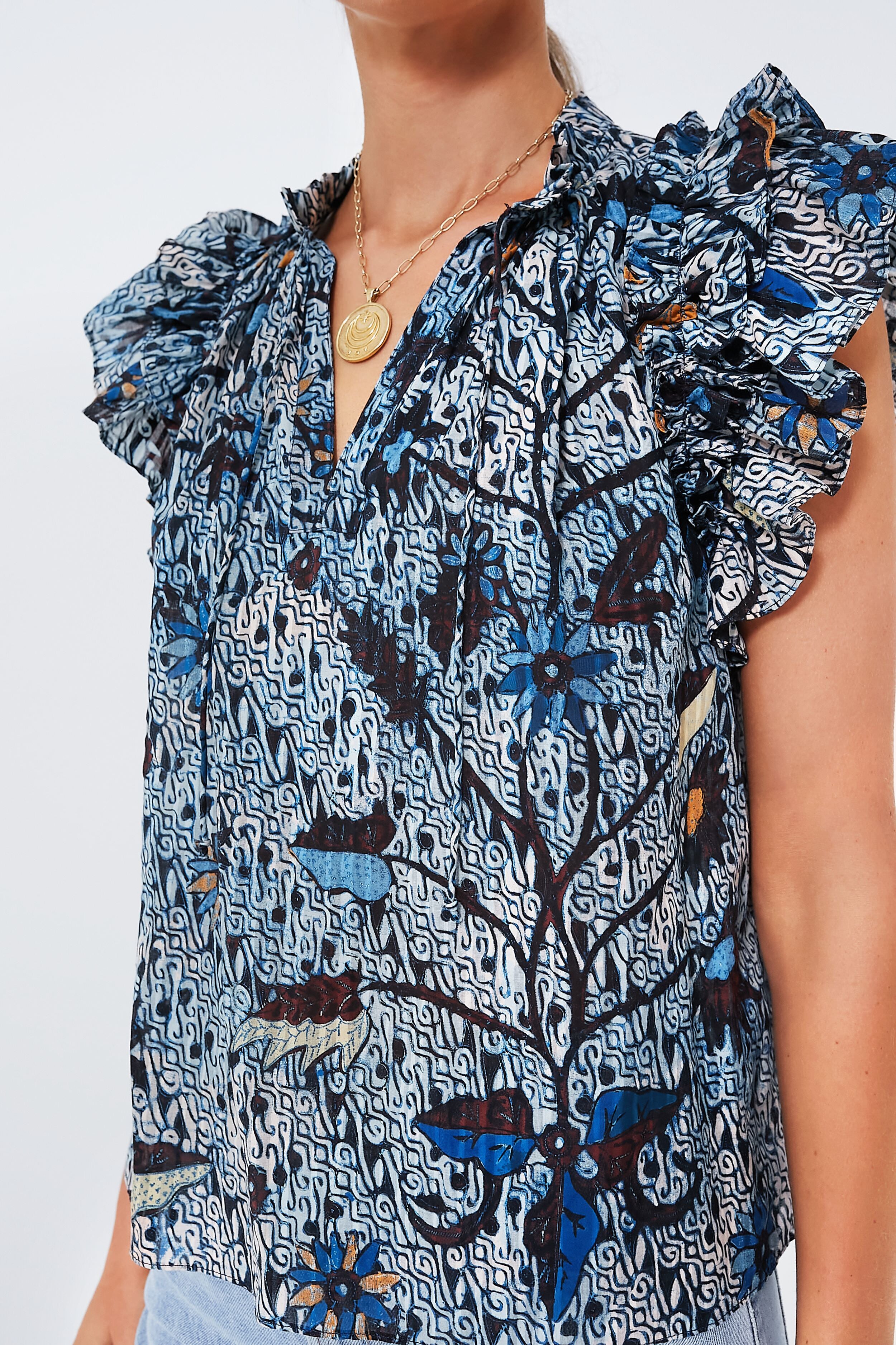 Framed by beautiful ruffles. the Morning Glory Fleur Top is dying to be worn. Featuring a split neckline with ties and a relaxed fit. this blouse is the perfect way to embellish any outfit. The stunning abstract blue floral print can be easily paired with denim. gold jewelry. and heels for a desk-to-drinks look or weekend brunch.