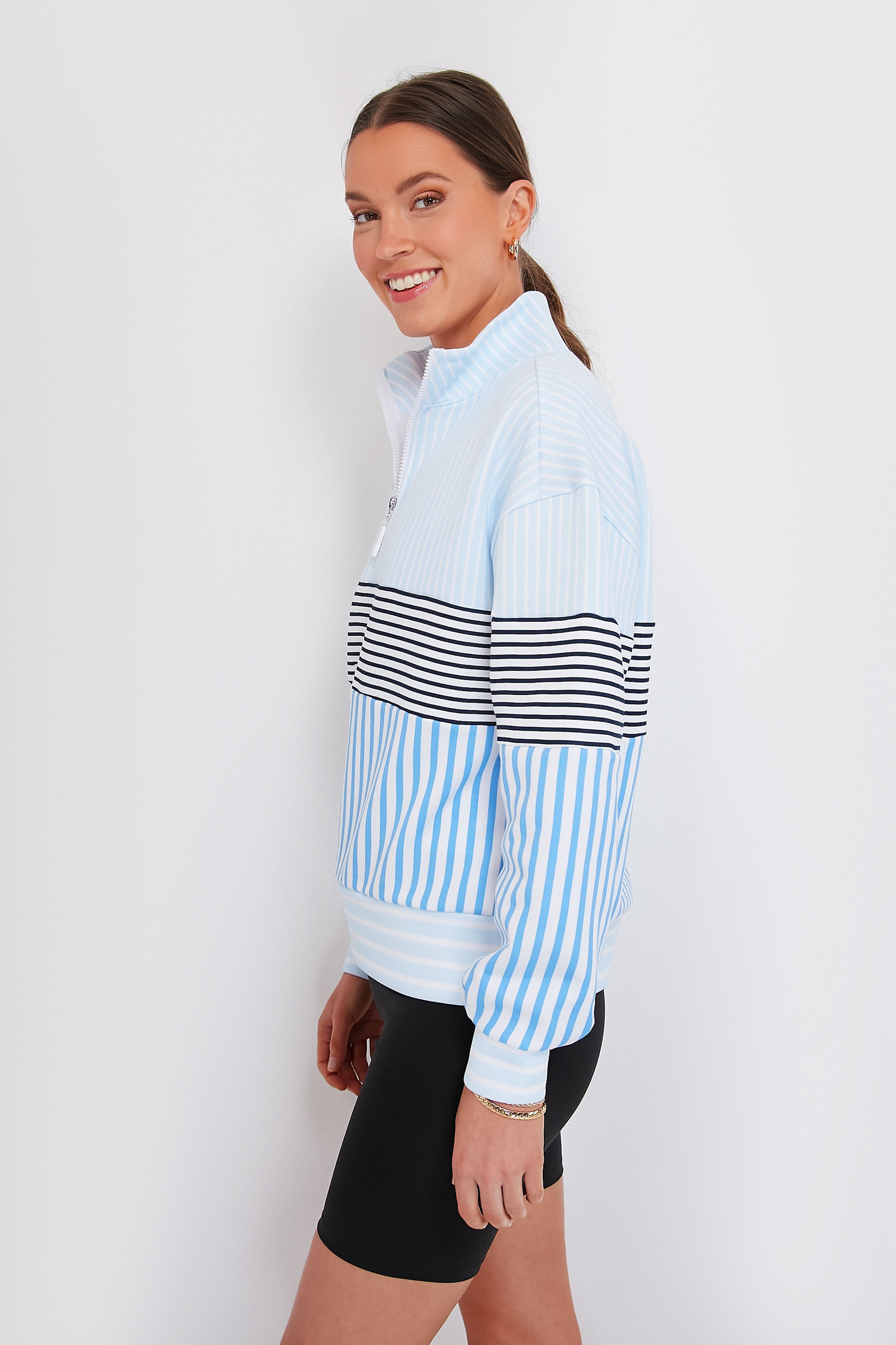 The Varsity Quarter Zip is our go-to layer. Featuring eye-catching color blocked stripes in various shades of blue. this cozy piece will have you looking and feeling your best. Pair with leggings. shorts. denim. you name it. for morning coffee runs and windy beach afternoons. we're sure this essential number will have you covered.