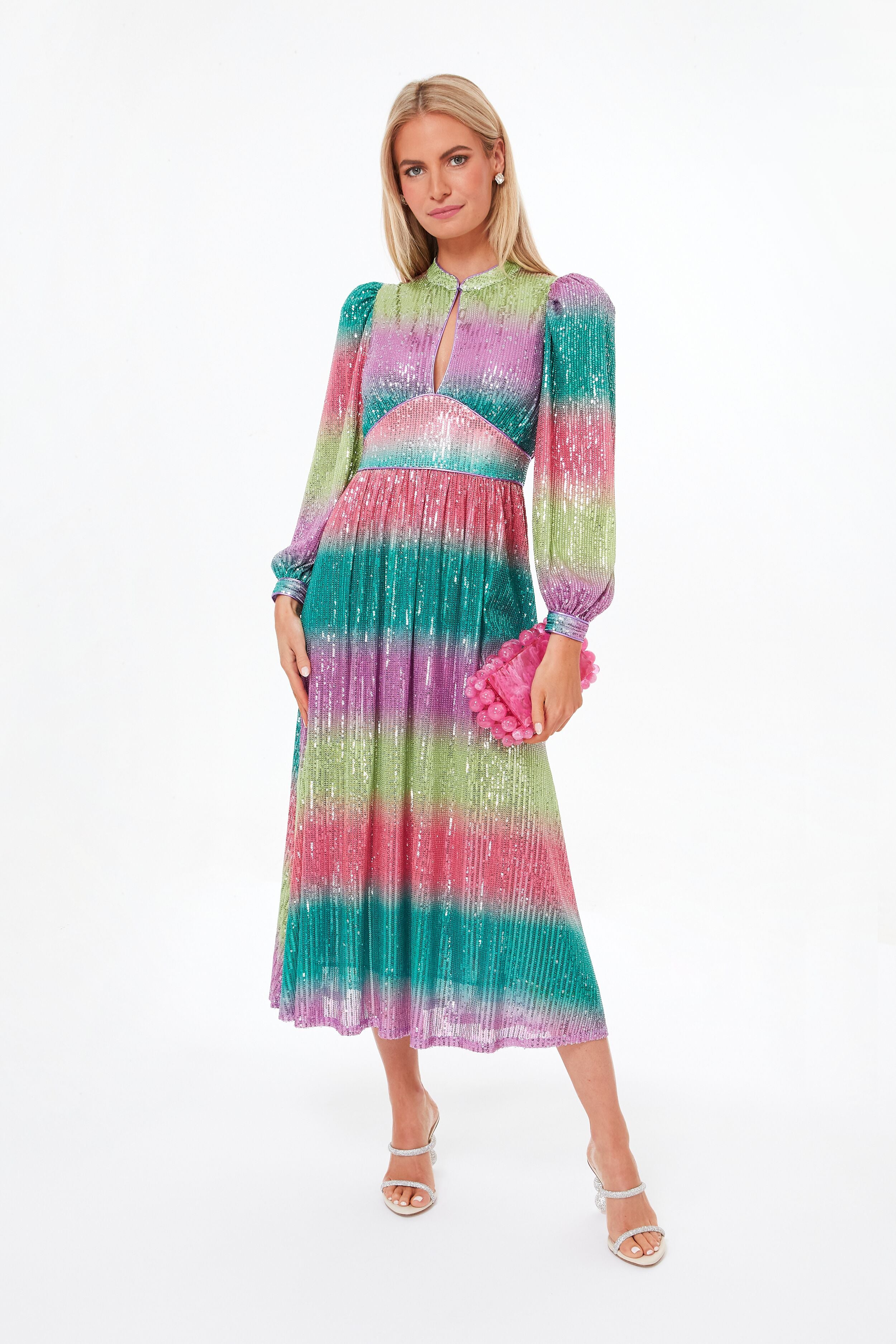 Bring on the glitz and glam with the Multi Cuarzo Dress! We cannot stop oohing and awing over all the gorgeous details in this midi- the front keyhole cutout is accentuated by a banded collar for added flirtiness. meanwhile the fitted waist transitions into a flowing skirt. and all adorned with sequin embellishments for over-the-top feels. Get the party started and add shimmering heels and bold accessories for all the occasions on your calendar this season!