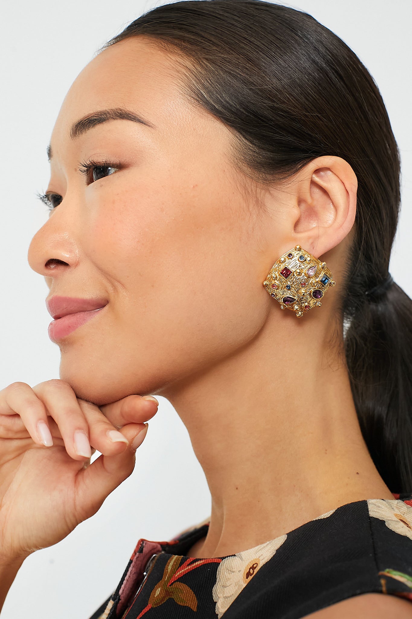 A nod to baroque opulence. the Multi Deon Earrings will add magic to your any look. Inspired by vintage pairs. these studs are bezel-set with fine crystals in a variety of cuts and hues. which pop against a textured golden backdrop. Perfect for adding a touch of drama to your ensemble. they can dress up any classic silhouette.