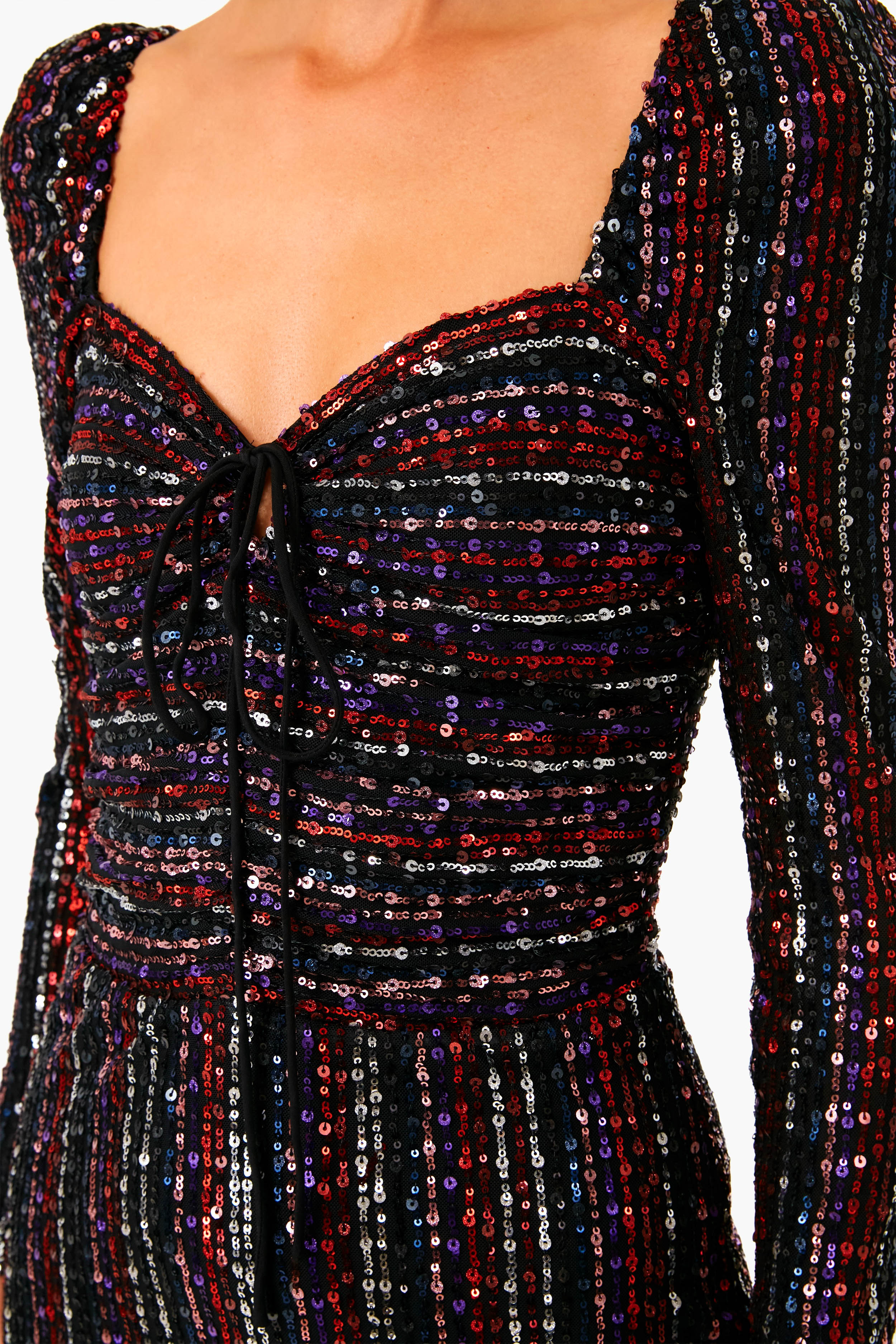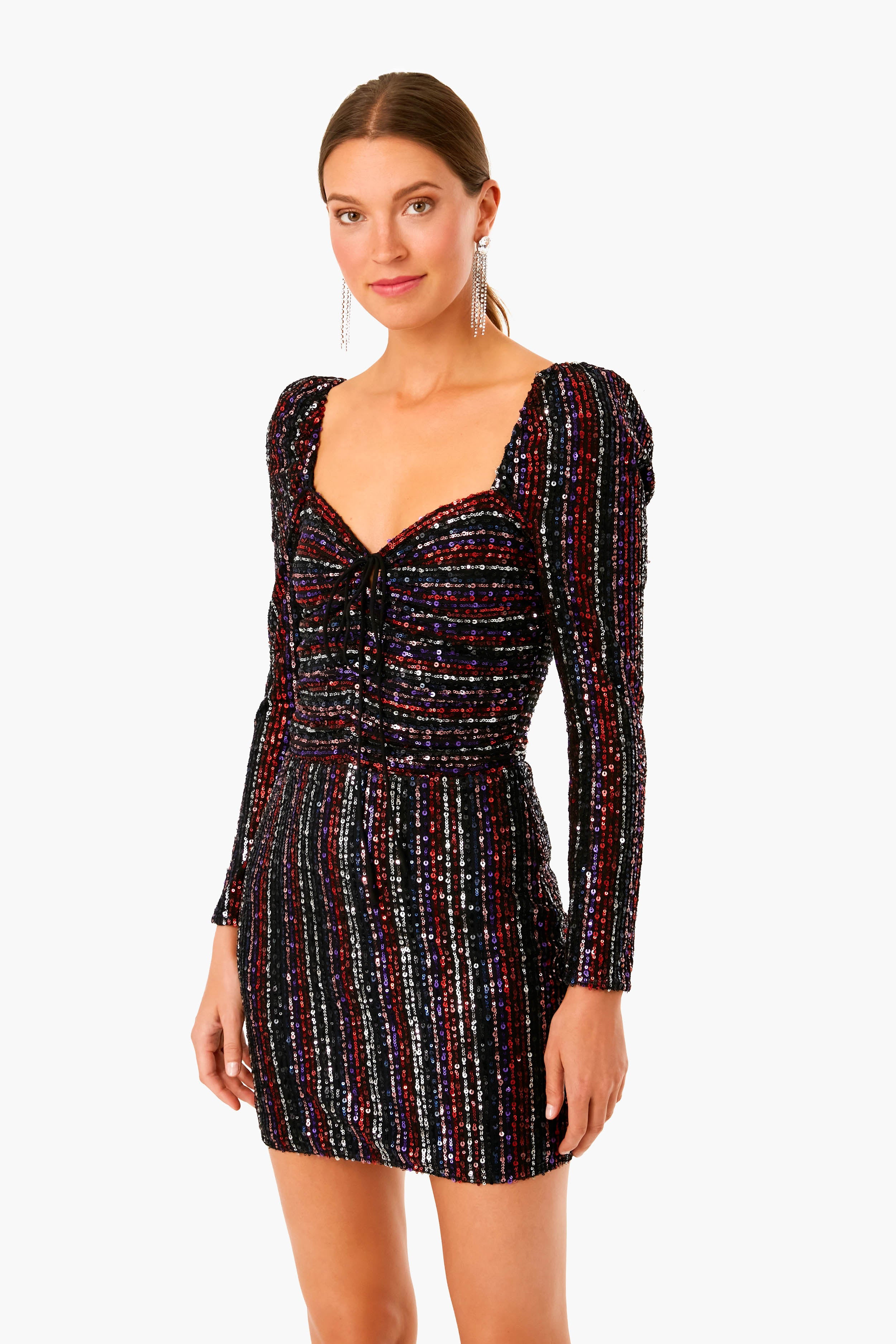 A striped sequin mini? Say no more. The Multi Didion Dress is a long sleeve stunner with a mix of black. pink. red. and purple sequins. With a keyhole cutout and ties that can be done around your neck or together in the front. this versatile style is ready to dance the night away. Just add statement earrings and a clutch for a glamorous look that is sure to turn heads.