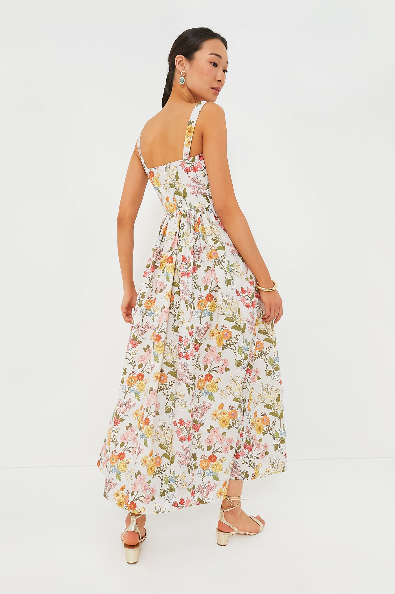 A garden of vibrantly colored flowers blooms across the Multi Floral Dress. A shape made to flatter all silhouettes. this easy. breezy cotton midi features a scoop neckline. a structured waist. side pockets which instantly make us love it more. and shirred skirt that promote effortless movement. Style it with a sweater thrown over the shoulders. with sandals or sneakers. and gold jewelry for an effortless look that works well for luncheons. baby showers. and other sunny celebrations.