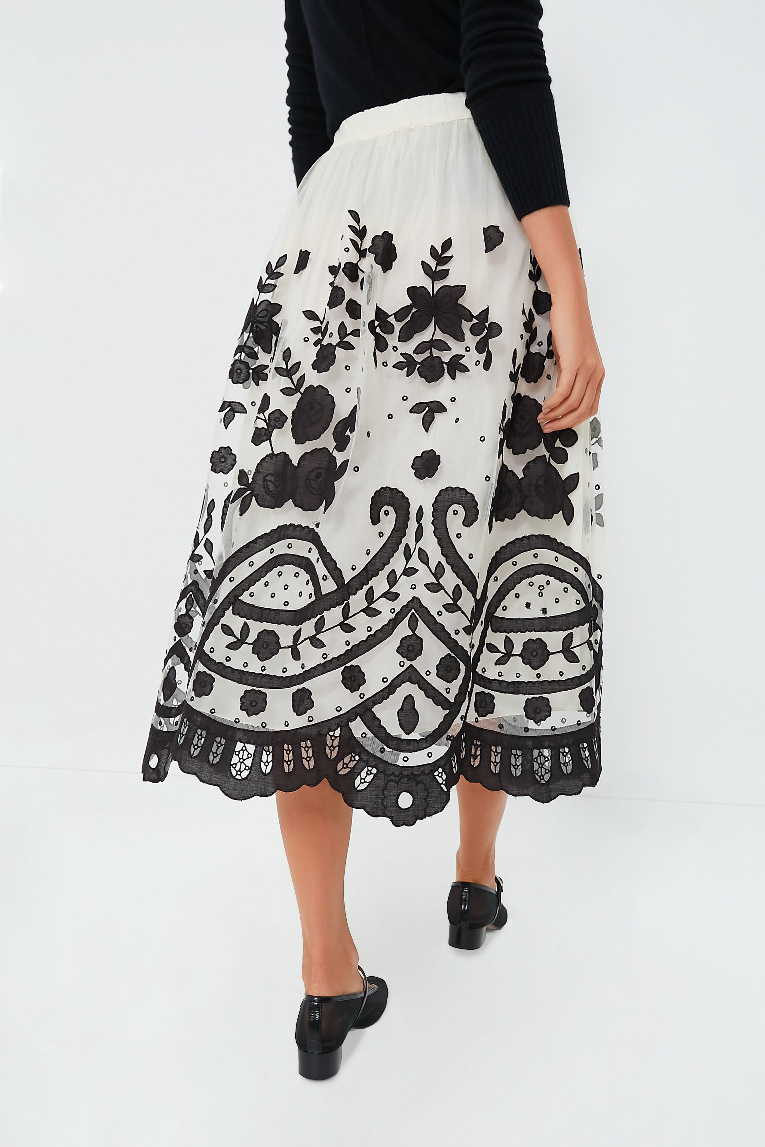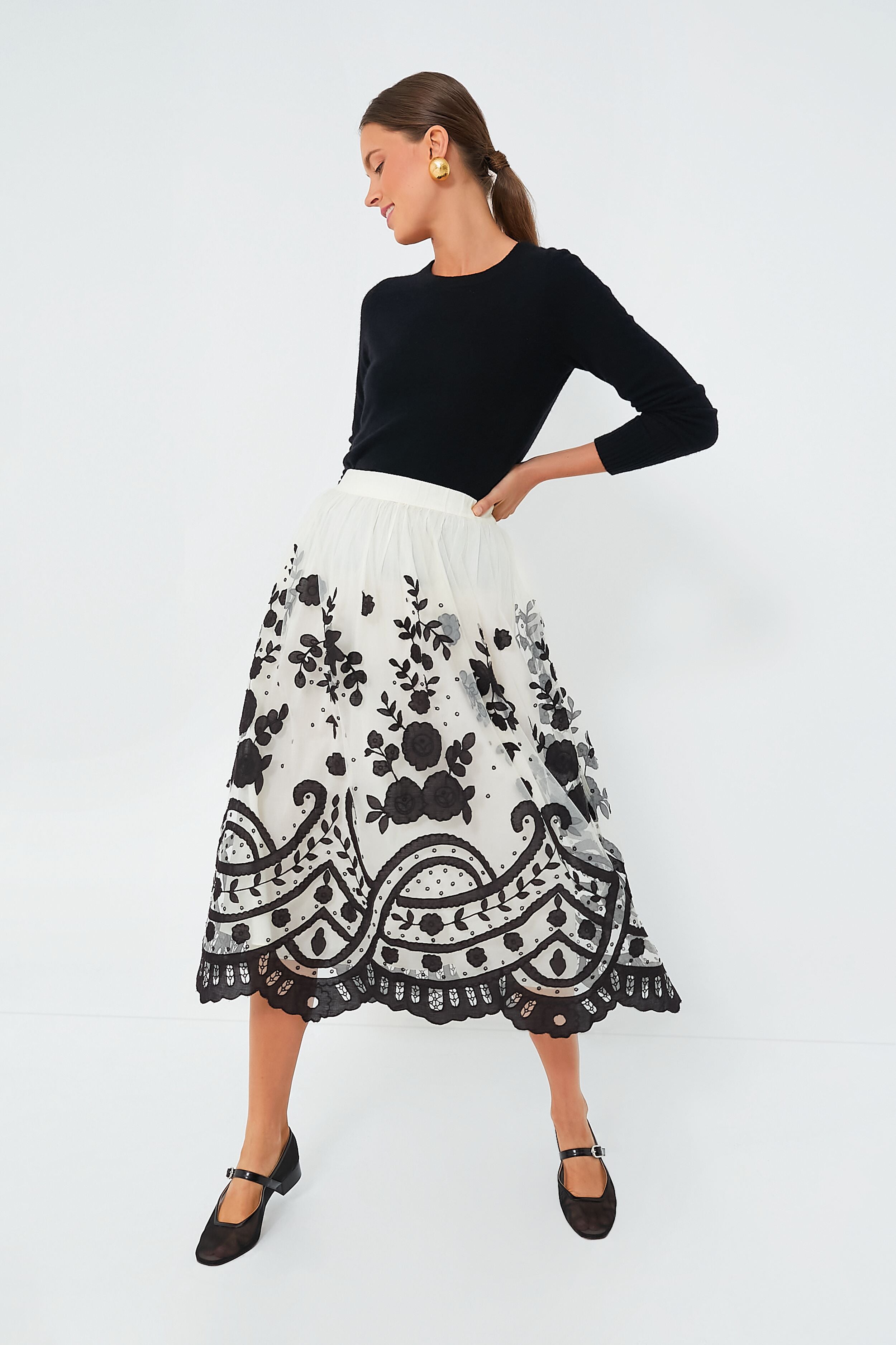 Black blooms add loads of charm to the Multi Joelle Applique Skirt. Cut in a lovely A-line silhouette. this work of art features an elasticated waistband and a sweet scalloped hem that we love! Perfect for an after work event. a special occasion. or a dinner party. this unique piece is breathtaking and will live in your wardrobe for years to come. Style with a slim-fitting sweater or a sleek top and tall boots for an unforgettable ensemble.