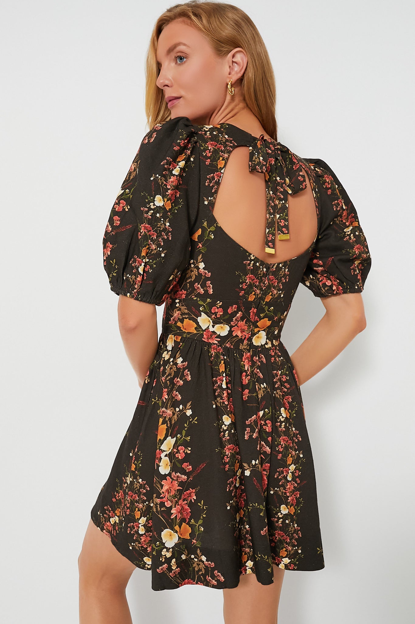 Garden party? Florals are always invited. The Roseanne Mini is the fresh pick of the season. This flirty frock is covered in panels of beautiful florals. Our favorite details include puff sleeves. an open back finished with a bow. and the best part- side pockets. Pair the multi colored mini with neutral heels for a dinner party ready look.