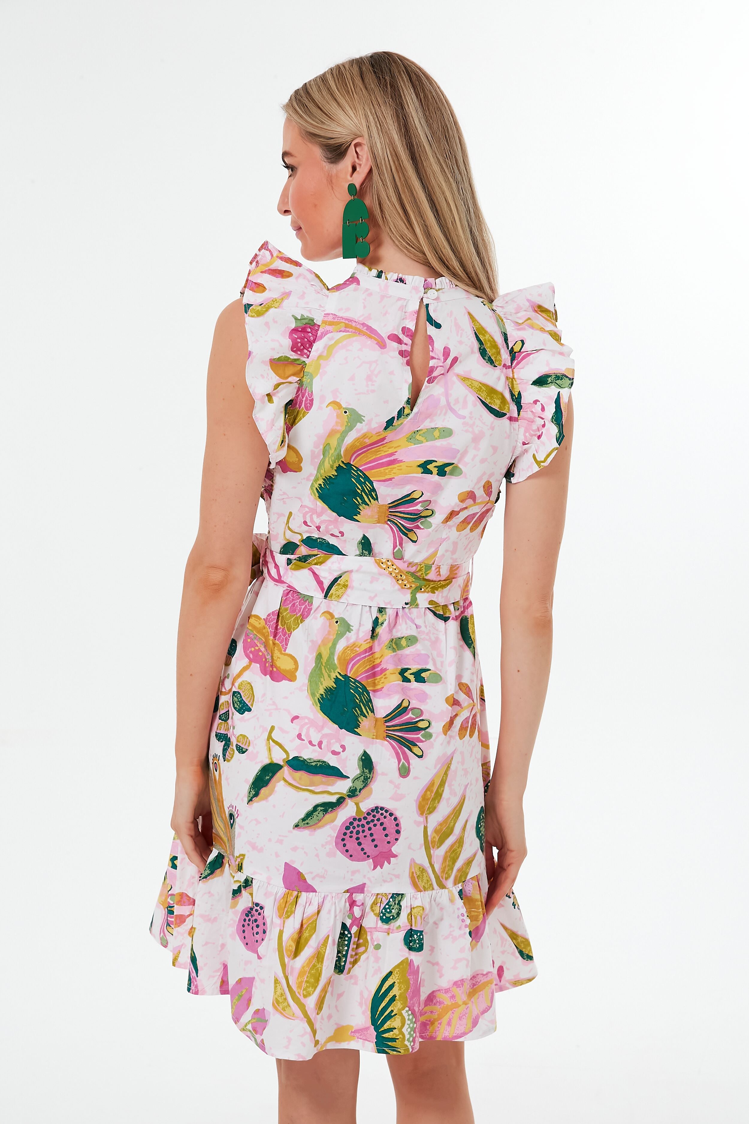 Inspired by the rich tradition of folk art. the Muse Spring Bulbul Dress features Indian birds and mammals in a bright and rich colorway. making for a truly unique and stunning print. And the details don't stop there– constructed with a feminine ruffle collar. voluminous flutter sleeves. and a tie waist belt for a flattering effect. this mini is working overtime. Don't be afraid to go big and accessorize with bold pops of color for a fun and unexpected look that'll take you from luncheons to evening events with ease!