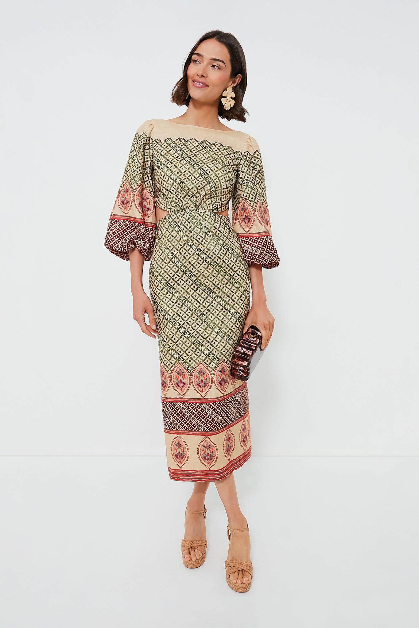 The Neelam dress is a midi linen style with a cut-out and lace-up detail at the waist and features a button-down back bodice and full puffed sleeves. Fern green and burgundy mosaic tiles are adorned with teardrop floral jewelled borders. Uniquely elegant. we are pairing this with heels and statement earrings for a show-stopping look.