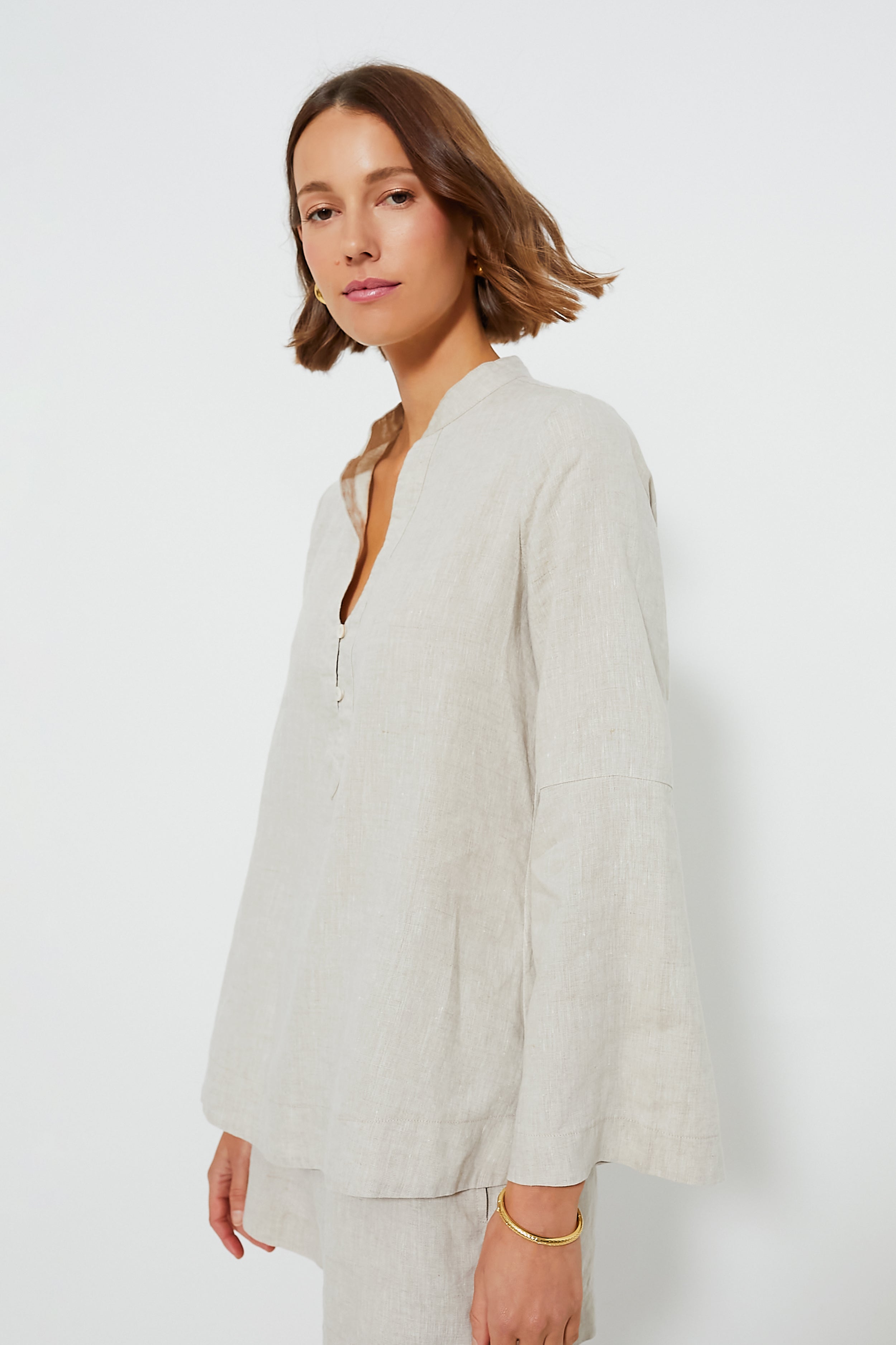 Introducing the Linen Tatum Popover- a breezy top that you can easily dress up or down for countless occasions. This blouse features long bell sleeves. a mandarin collar with a V-notch. and a two-button placket. Pair with trousers and ballet flats for work. or with the matching Linen Elena Shorts and sandals for a casual weekend look.
