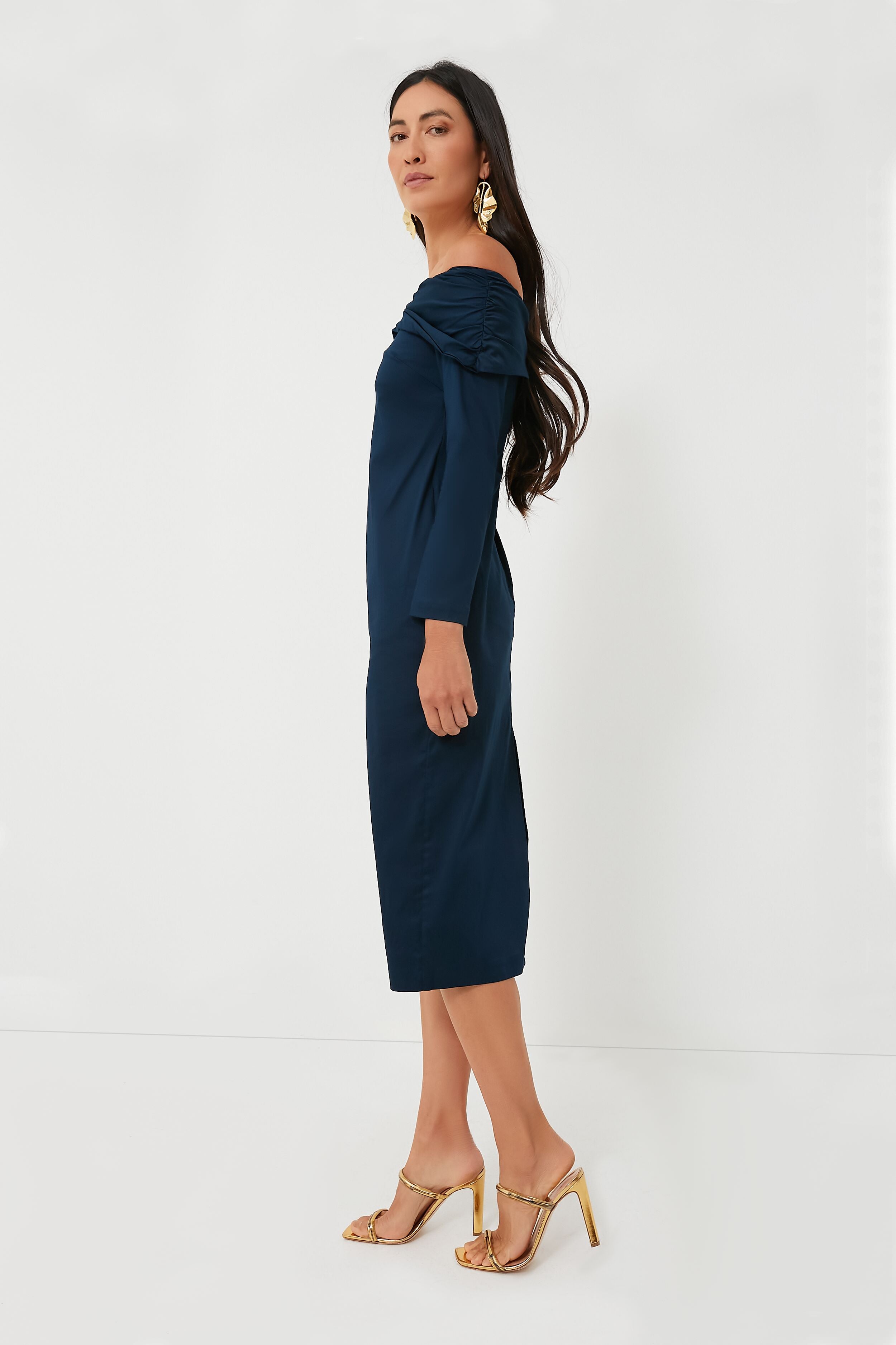 The Navy Aliette Dress does something truly incredible — it makes you feel like the most elegant and polished version of yourself the second you slip it on. A sleek and chic sheath. this satin stunner features an off the shoulder neckline that is uniquely gathered for extra texture. slim long sleeves. and a figure-skimming skirt with a slit at the back for easy movement. Truly eye-catching. this silhouette will look amazing paired with heels and statement earrings for all your RSVPs this season!
