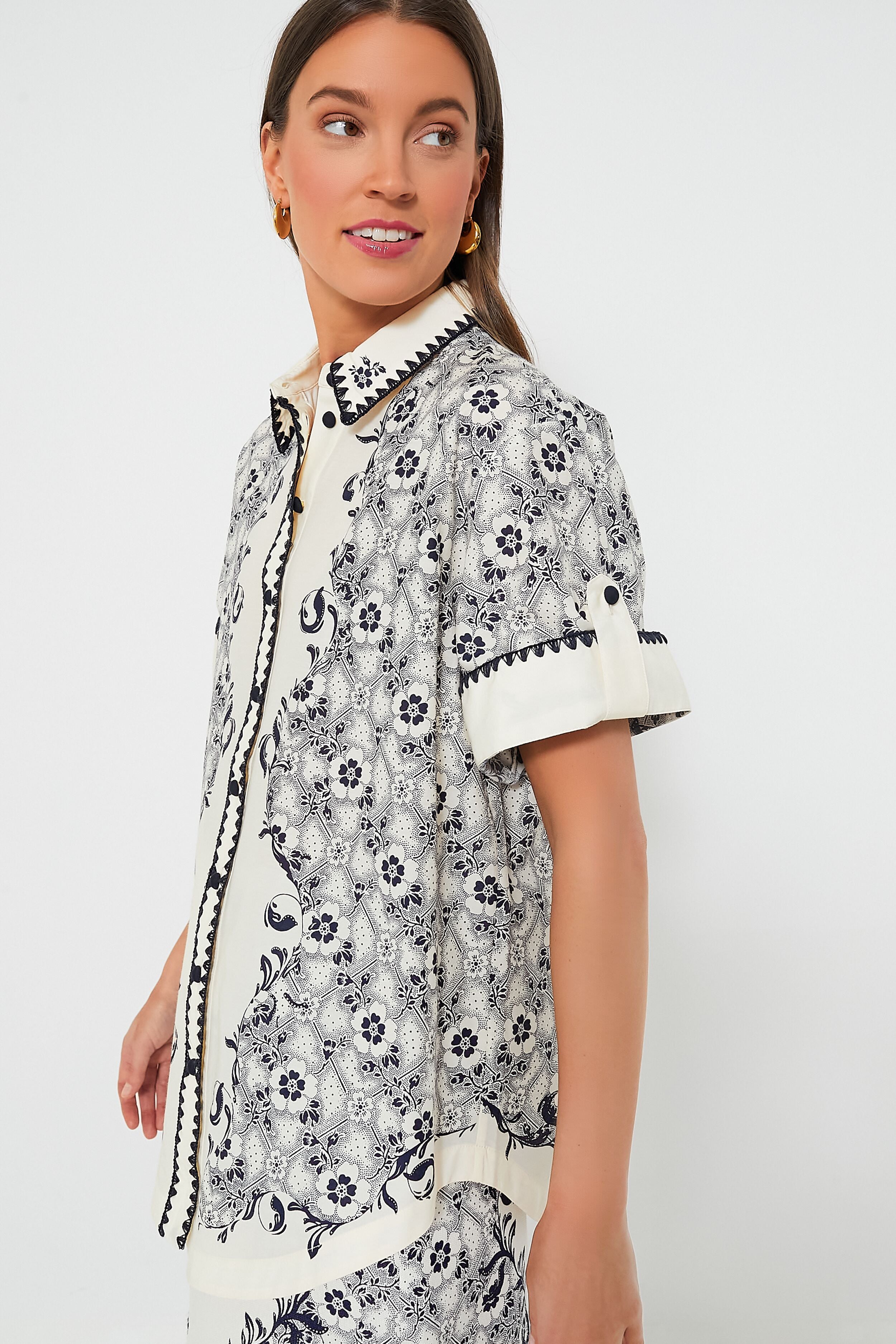 A classic button-down with a twist. we are loving the Navy and Cream Airlie Shirt. Boasting an oversized silhouette. contrast stitching. and an intricate floral pattern. this luxe top is a warm-weather must-have. Pair with navy shorts and sneakers for a casual look. or with the matching Navy and Cream Airlie Skirt and sandals for an elevated approach.