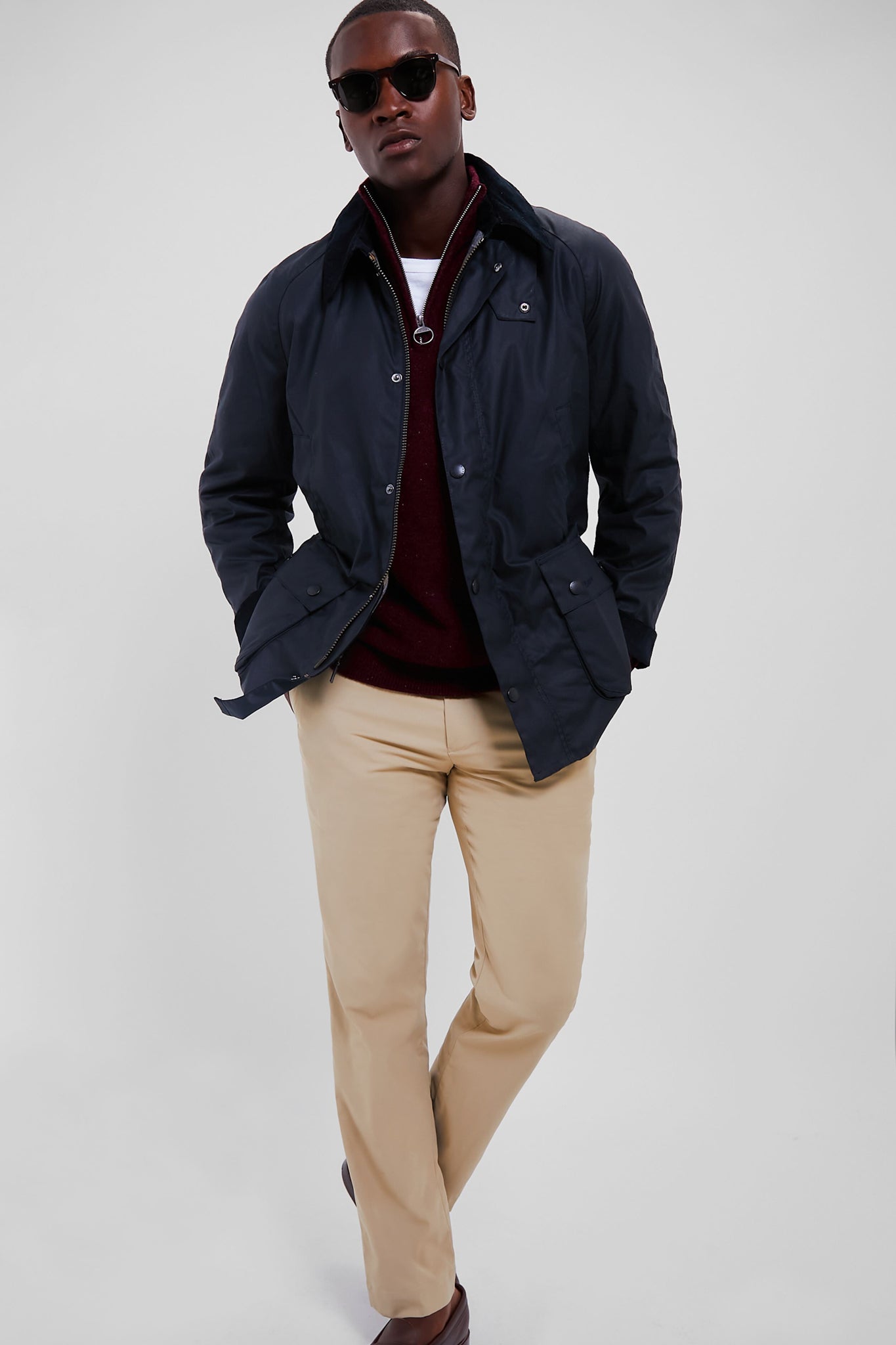 Reworking the classic Bedale in a robust wax finish. the Ashby Wax Jacket is a year-round layer that is ready for anything. and is as timeless as it is practical. Slightly more tailored than the Bedale. yet still retaining enough room for essential layers. you're going to reach for this style again and again no matter the weather forecast. Stay warm while looking cool at sporting events and outdoor adventures this season when you pair this with your favorite baseball hat and your go-to khakis or jeans.